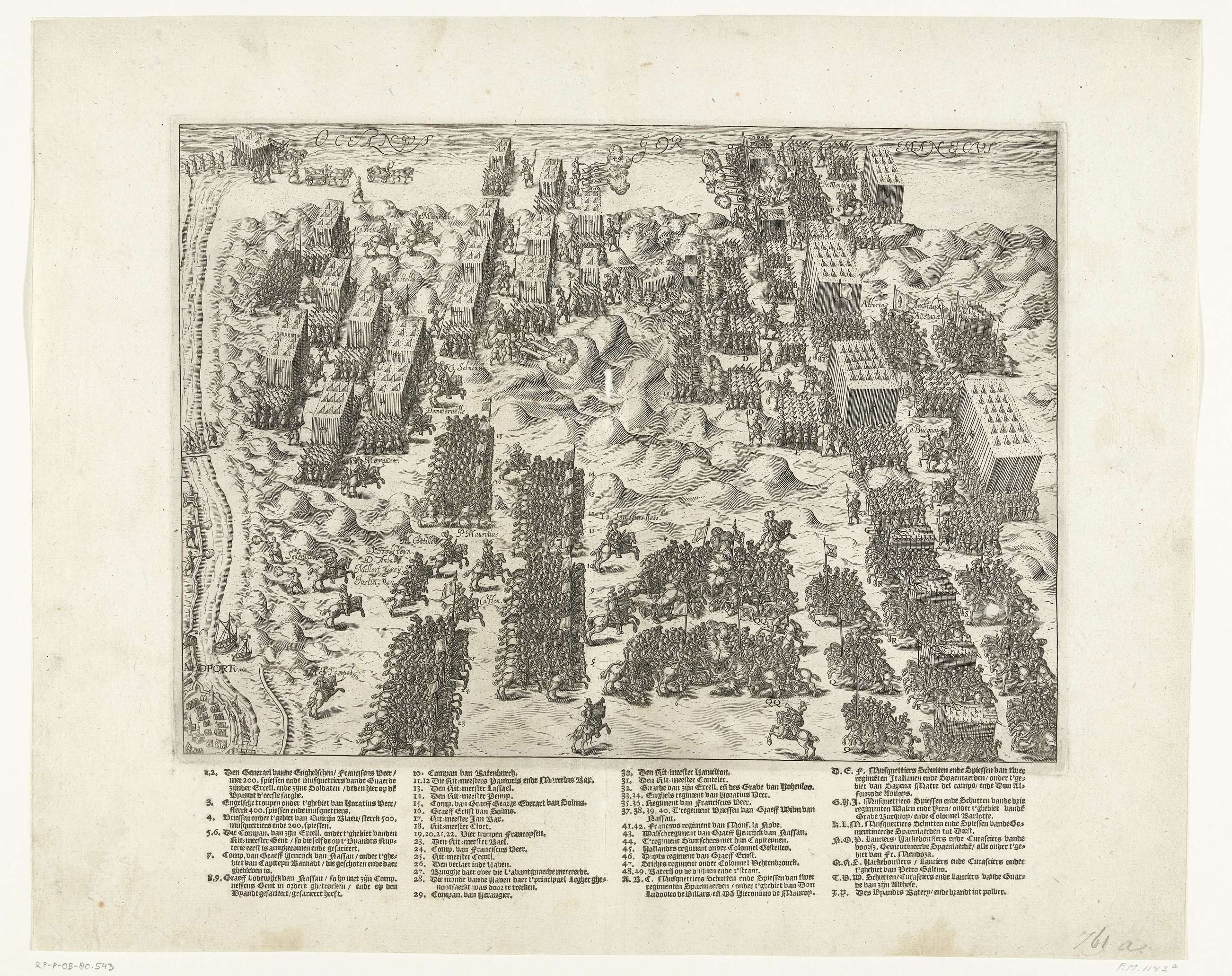 Slag bij Nieuwpoort. De Staatse en Spaanse legers in gevecht met elkaar op het strand bij Nieuwpoort, 2 juli 1600. Linksonderaan de stad Nieuwpoort. Apart gedrukt onder de voorstelling de legenda's 1-49 en A-Y in het Nederlands.