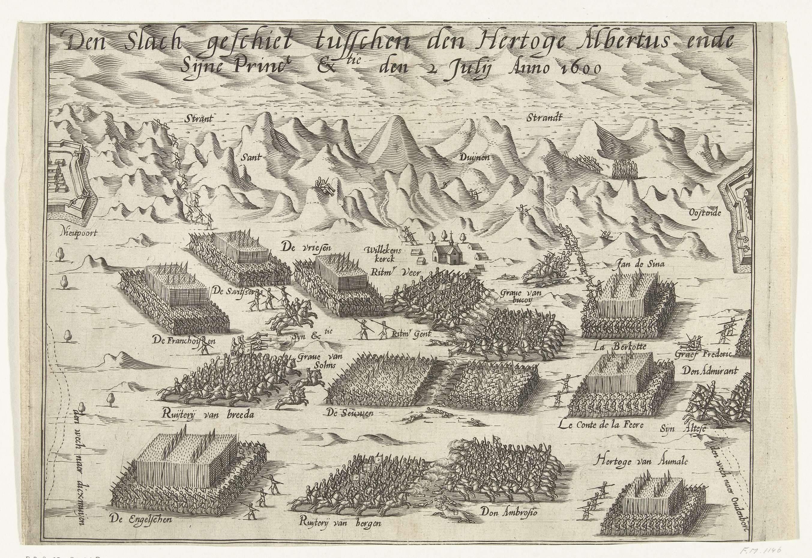 De slag bij Nieuwpoort, 2 juli 1600. Gevechten op het strand en in de duinen tussen het Staatse leger onder Maurits en de Spaanse troepen onder Albrecht.