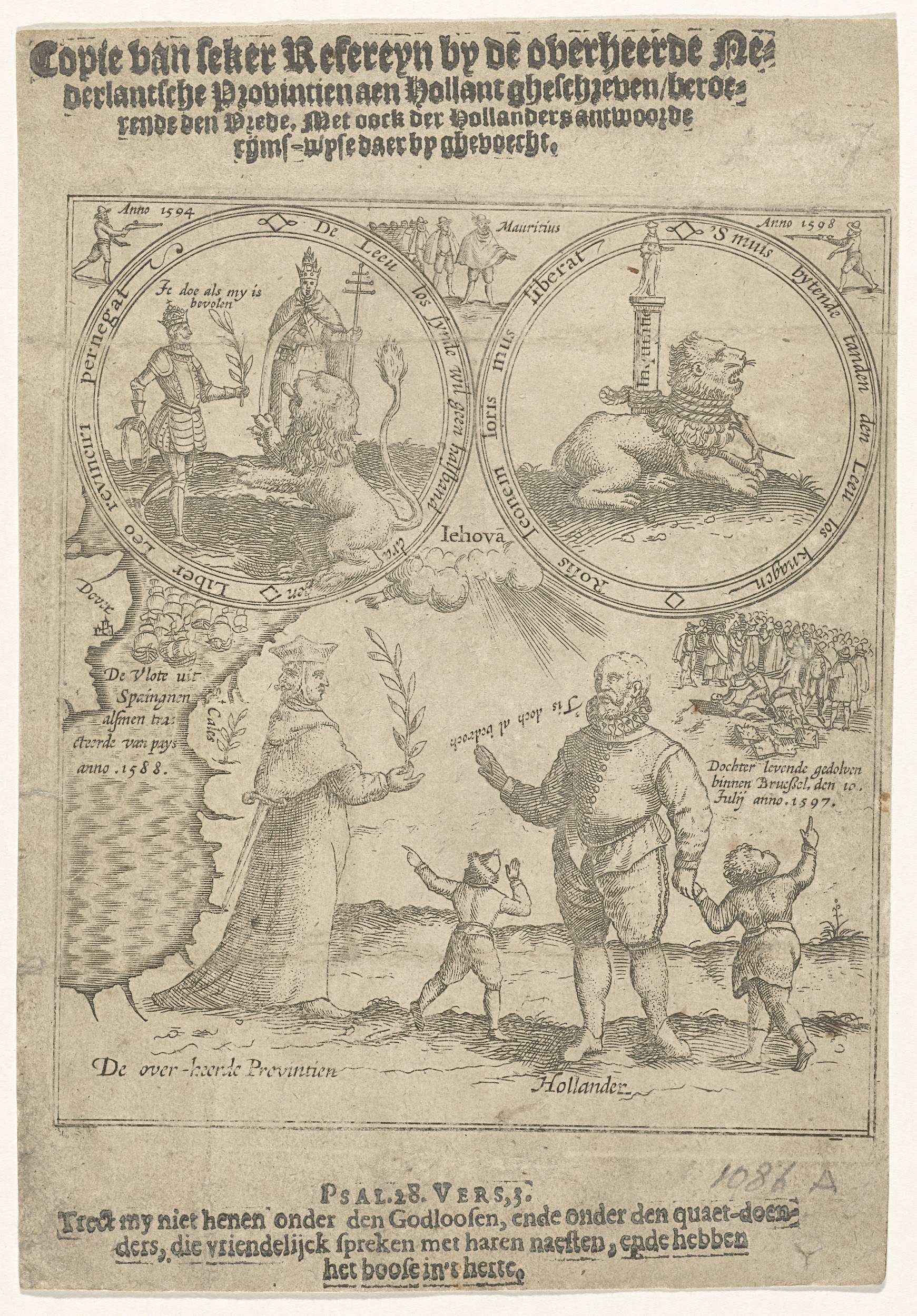 Allegorie op de bedriegelijke vredesvoorstellen door Spanje, 1598. Titelprent van een pamflet getiteld: Copie van seker Refereyn by de overheerde Nederlantsche Provintien aen Hollant gheschreven / beroerende den Vrede. Met oock der Hollanders antwoorde rijms-wyse daer by ghevoecht. Een Spaanse Nederlander met twee gezichten biedt de Hollander een olijftak aan. Rechts een kleine voorstelling waarin ...