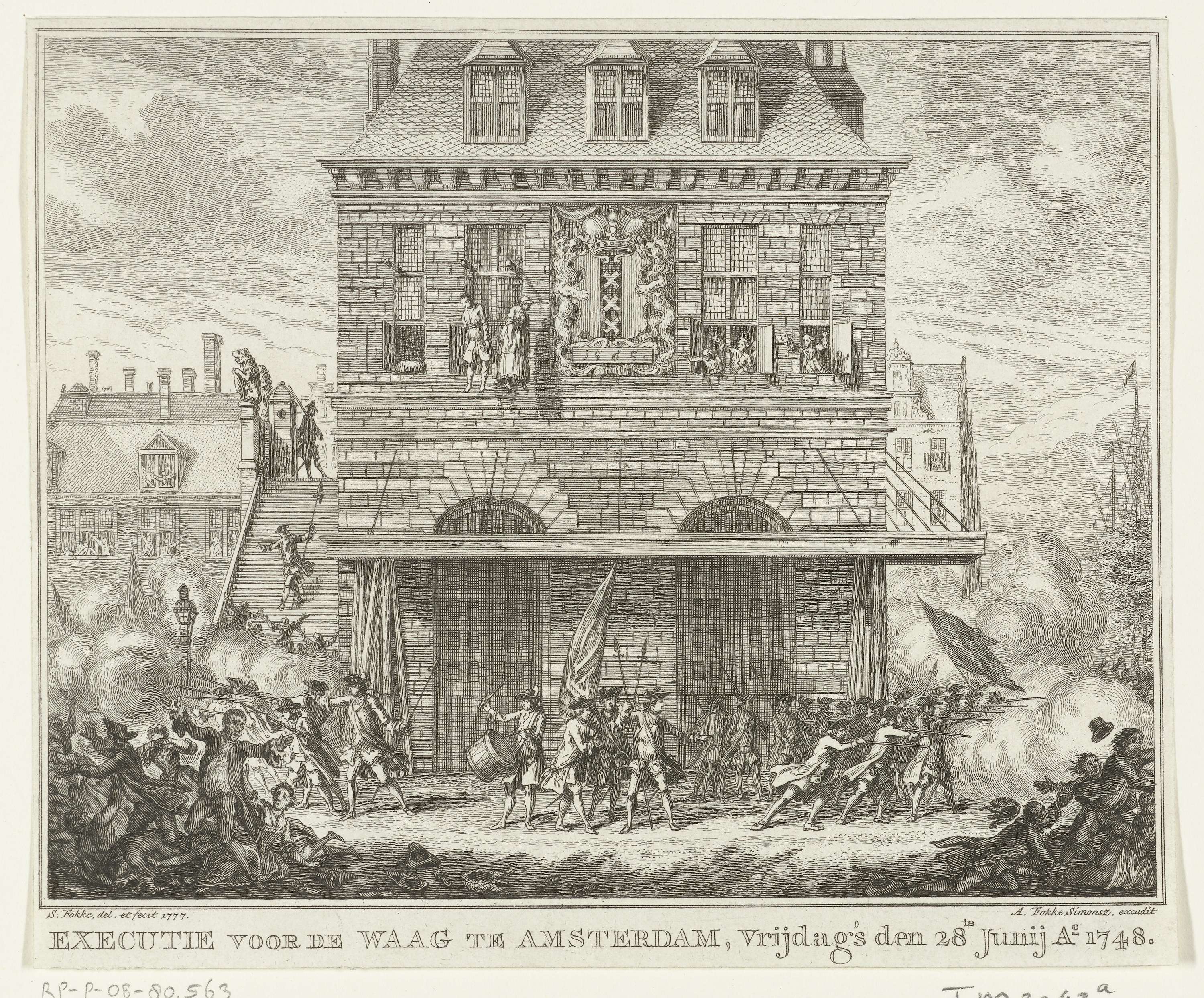 Onlusten tijdens de ophanging van een man en vrouw (Piet van Dort en de citroen- en gedroogde scholverkoopster Mat van den Nieuwendijk), twee deelnemers aan het Pachtersoproer, aan de Waag te Amsterdam, 28 juni 1748. De schutterij opent het vuur op de toeschouwers.
