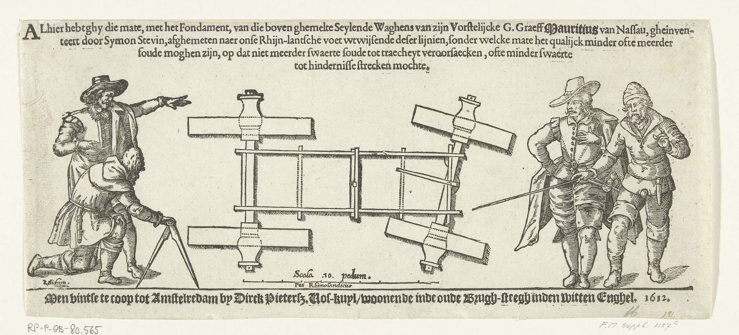 Diagram van de zeilwagen van Simon Stevin met aan weerszijden twee figuren, 1602. Met boven de figuren 4 regels tekst in het Nederlands. Dit blad behoort aan de onderzijde van de grote prent van de zeilwagen in drie platen gemonteerd te worden.