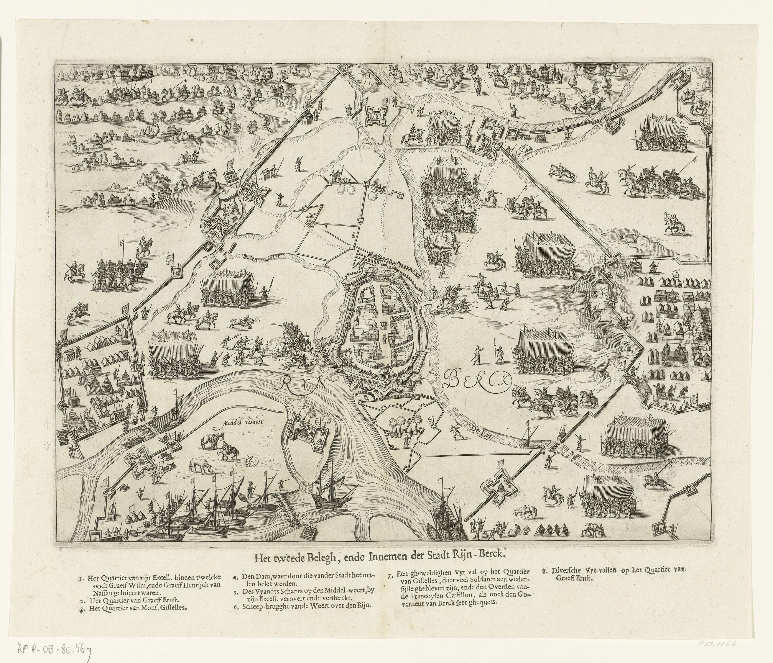 Belegering vanaf 12 juni en verovering op 31 juli 1601 van de stad Rheinberg door het Staatse leger onder prins Maurits. Plan van de stad en het omliggende land met het legerkamp van de prins. Onderaan het eiland in de Rijn en de schipbrug. Apart gedrukt onder de prent de titel en de legenda 1-8 ...
