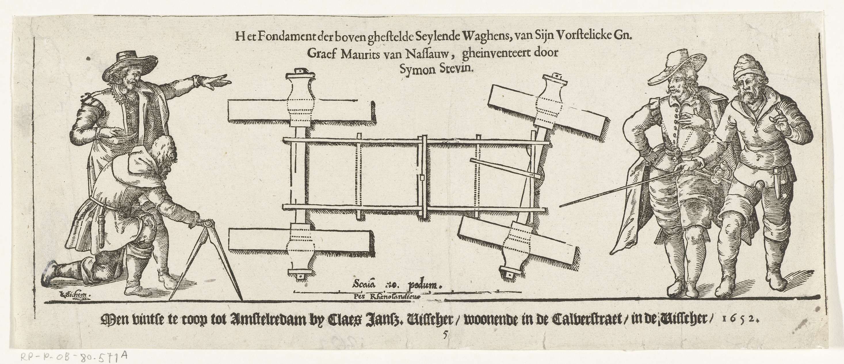 Diagram van de zeilwagen van Simon Stevin met aan weerszijden twee figuren, 1602. Met boven de figuren 3 regels tekst in het Nederlands. Onderdeel genummerd 5. Dit blaaden behoort aan de onderzijde van de grote prent van de zeilwagen in drie platen gemonteerd te worden.