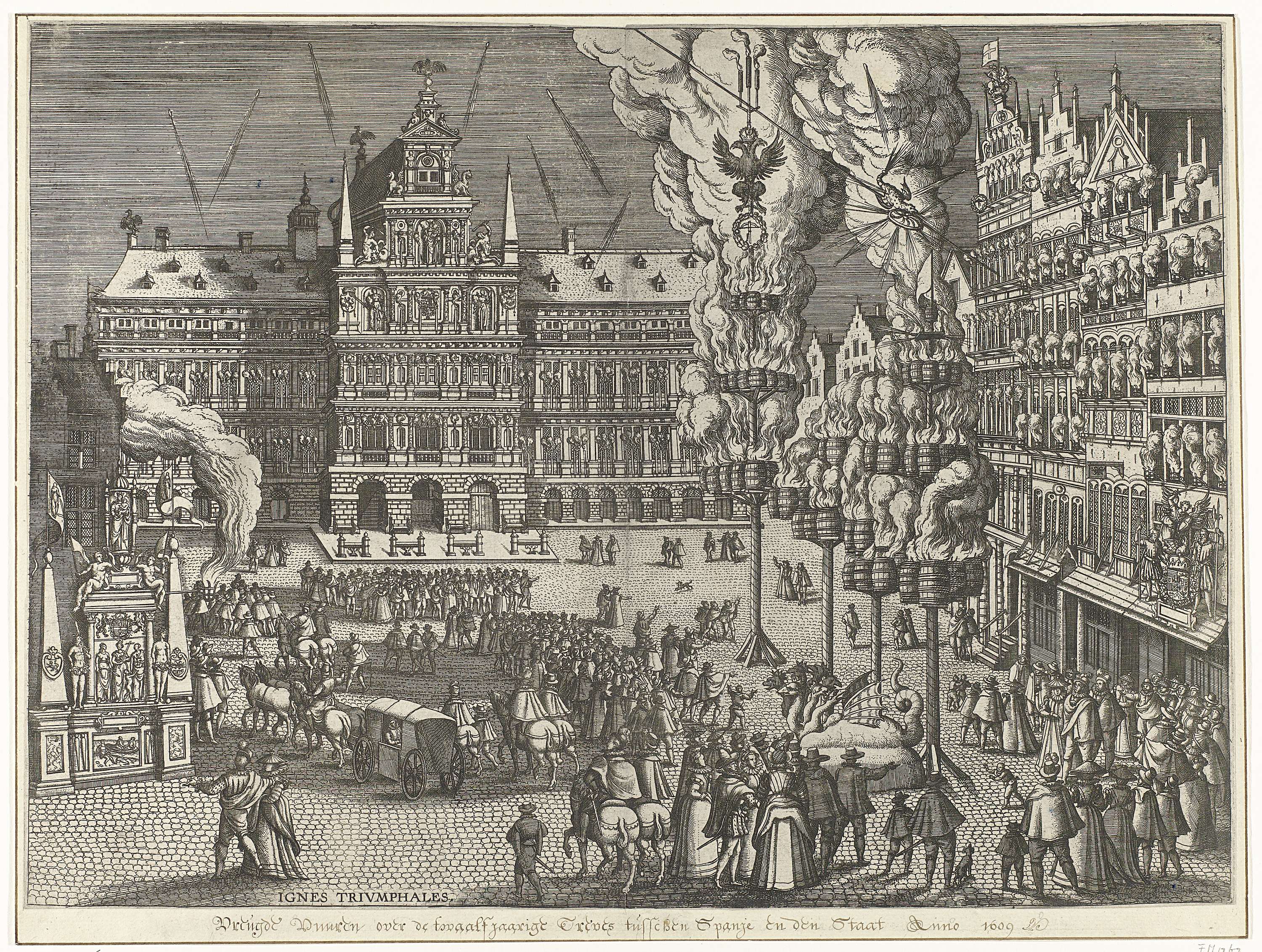 Aankomst van aartshertog Ernst op de Grote Markt te Antwerpen, onderdeel van de beschrijving van de intocht van aartshertog Ernst te Antwerpen, 18 juli 1594. Deze voorstelling is door Muller eerst geïnterpreteerd als vreugdevuren en vuurwerk op de Grote Markt ter viering van het Twaalfjarig Bestand te Antwerpen, 14 april 1609.