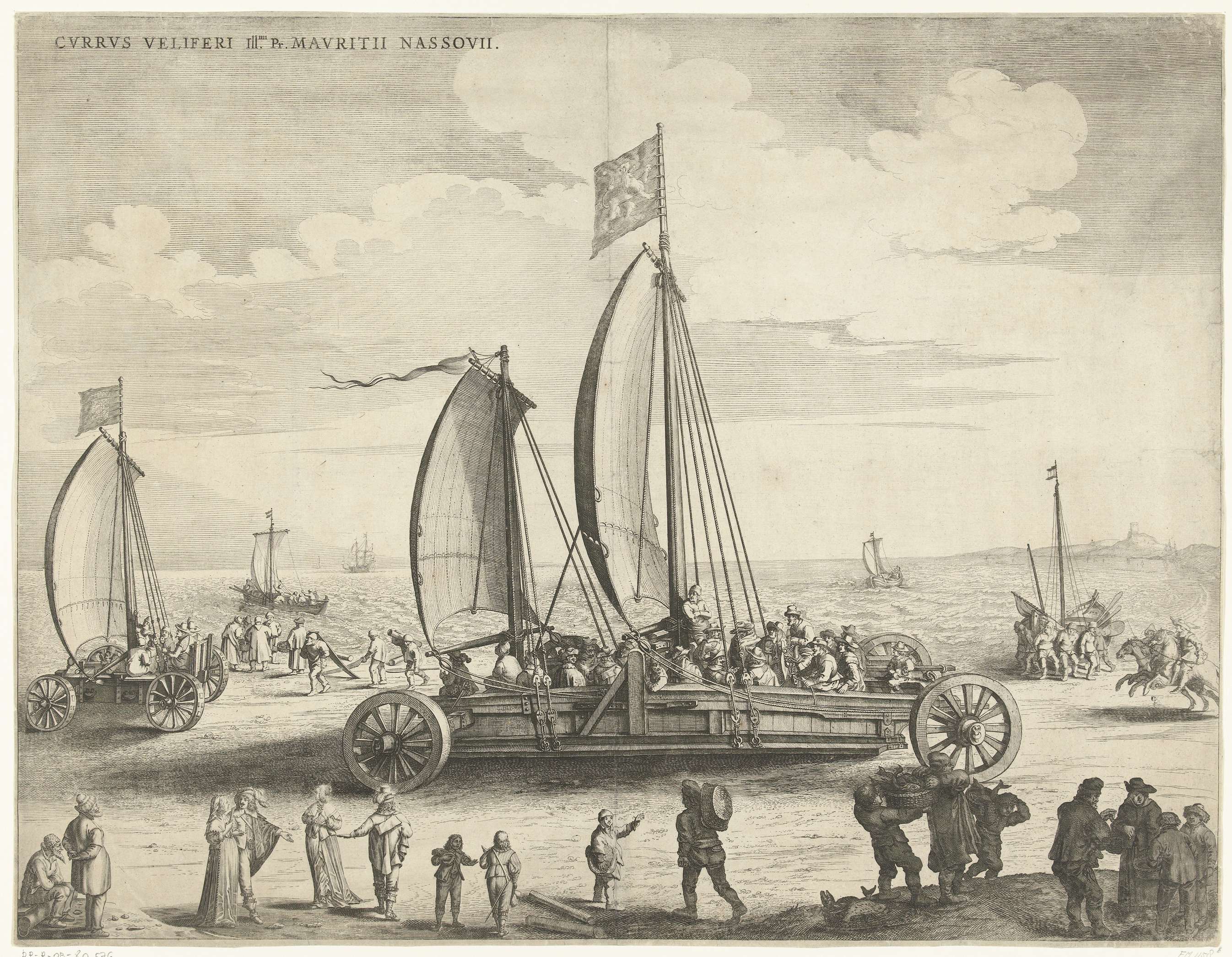 De zeilwagen van Simon Stevin, 1602. Prins Maurits maakt samen met een groep vrienden een tocht over het strand van Scheveningen naar Petten in de zeilwagen gebouwd door Simon Stevin, april-mei 1602. Links een kleine zeilwagen, waarschijnlijk een prototype, met enkele personen aan boord. Op het strand verschillende elegante toeschouwers en enkele vissers. Voor het ...