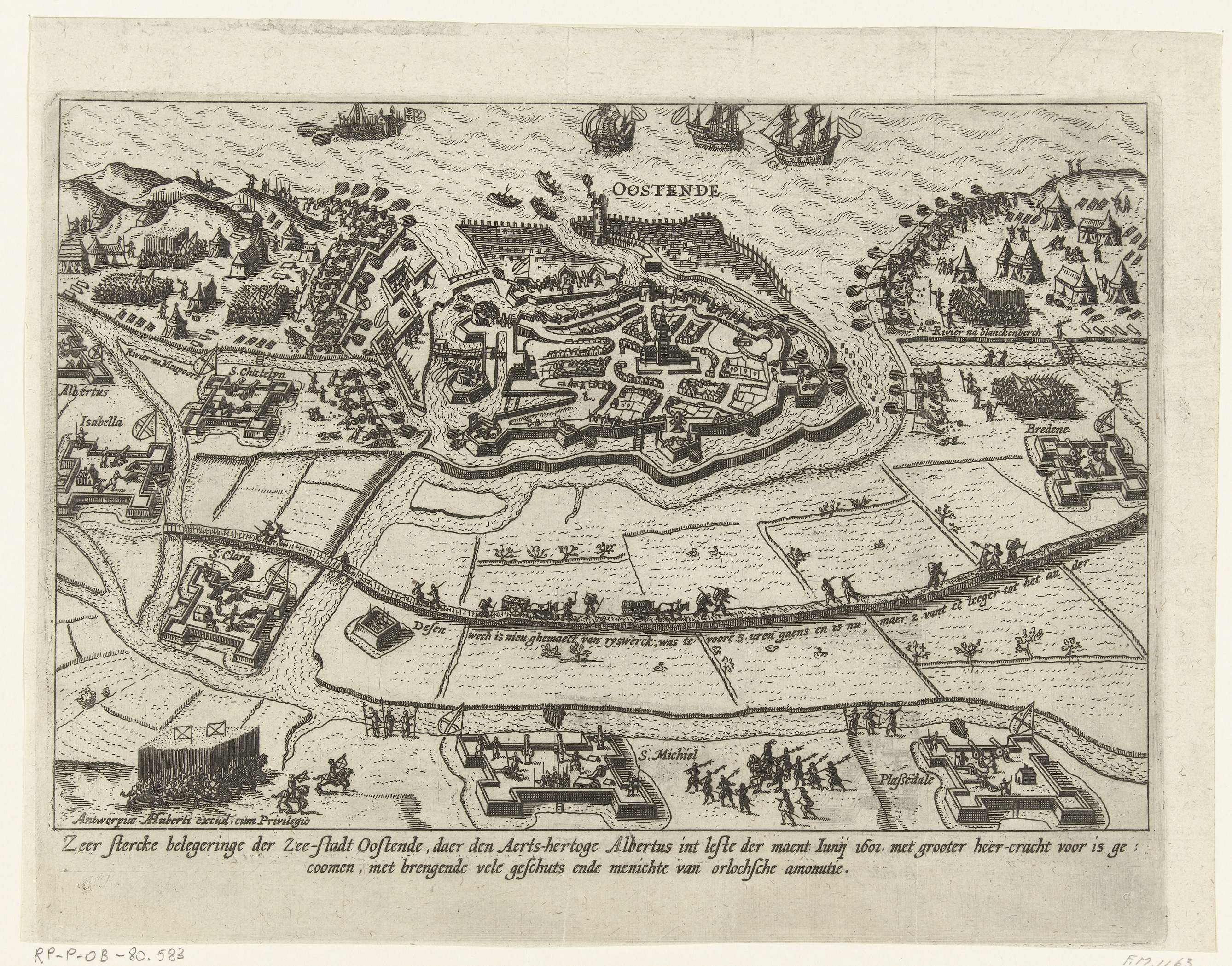Beleg van Oostende. Plan van de stad met het omliggende land met alle verdedigingswerken en de legerkampen van de belegeraars. Belegering van Oostende door het Spaanse leger onder Albertus en later onder Spinola van 1601-1604. Met onderschrift van 2 regels in het Nederlands.