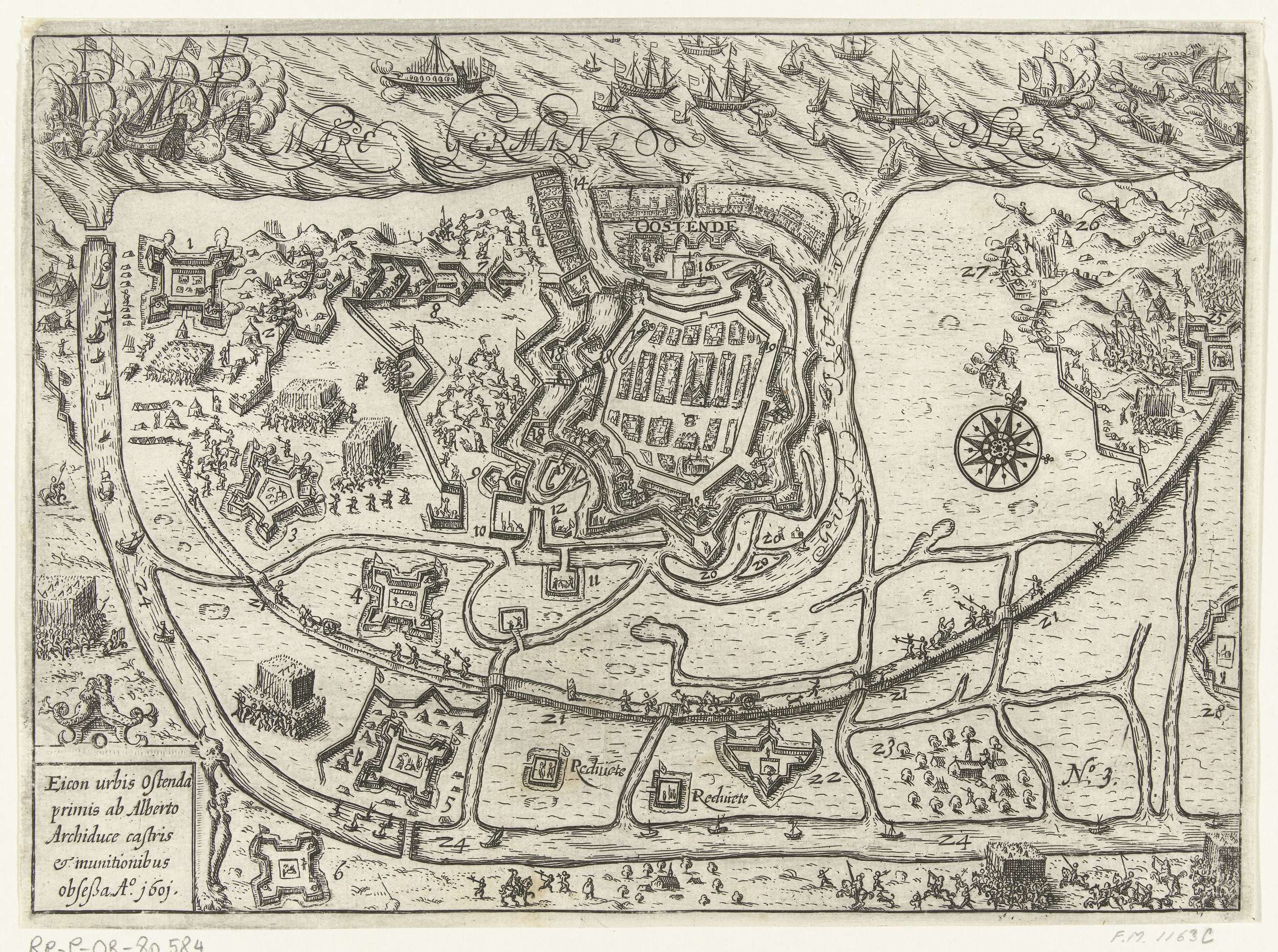 Beleg van Oostende. Plan van de stad met het omliggende land met alle verdedigingswerken en de legerkampen van de belegeraars. Belegering van Oostende door het Spaanse leger onder Albertus en later onder Spinola van 1601-1604. Genummerd: 3. Details in de voorstelling genummerd 1-28.