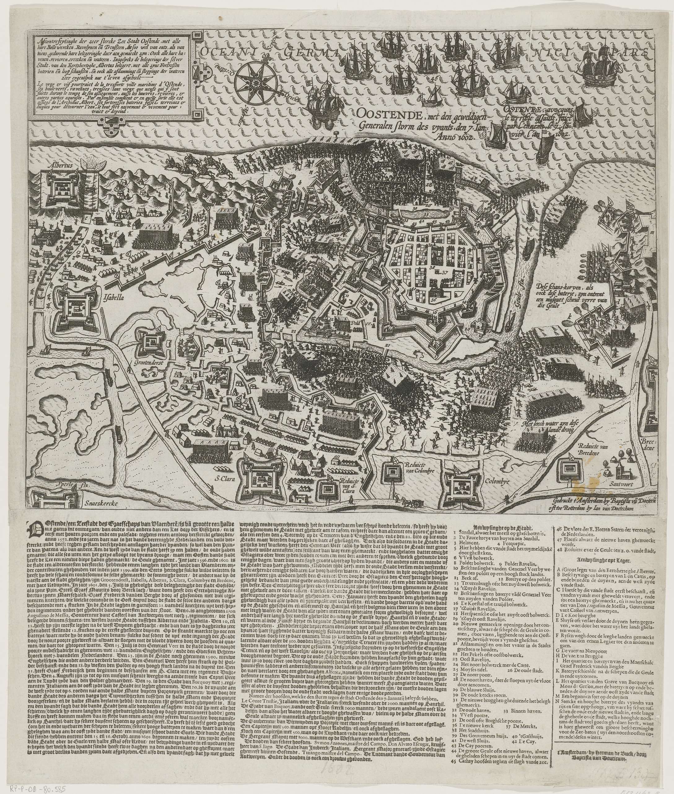 Bestorming van Oostende door het Spaanse leger op 7 januari 1602. Beleg van Oostende onder Albertus en later onder Spinola van 1601-1604. Plan van de stad met het omliggende land met alle verdedigingswerken en de legerkampen van de belegeraars. Met gevechten rondom de stad en de aanval van de belegeraars op 7 januari 1602. Linksboven ...