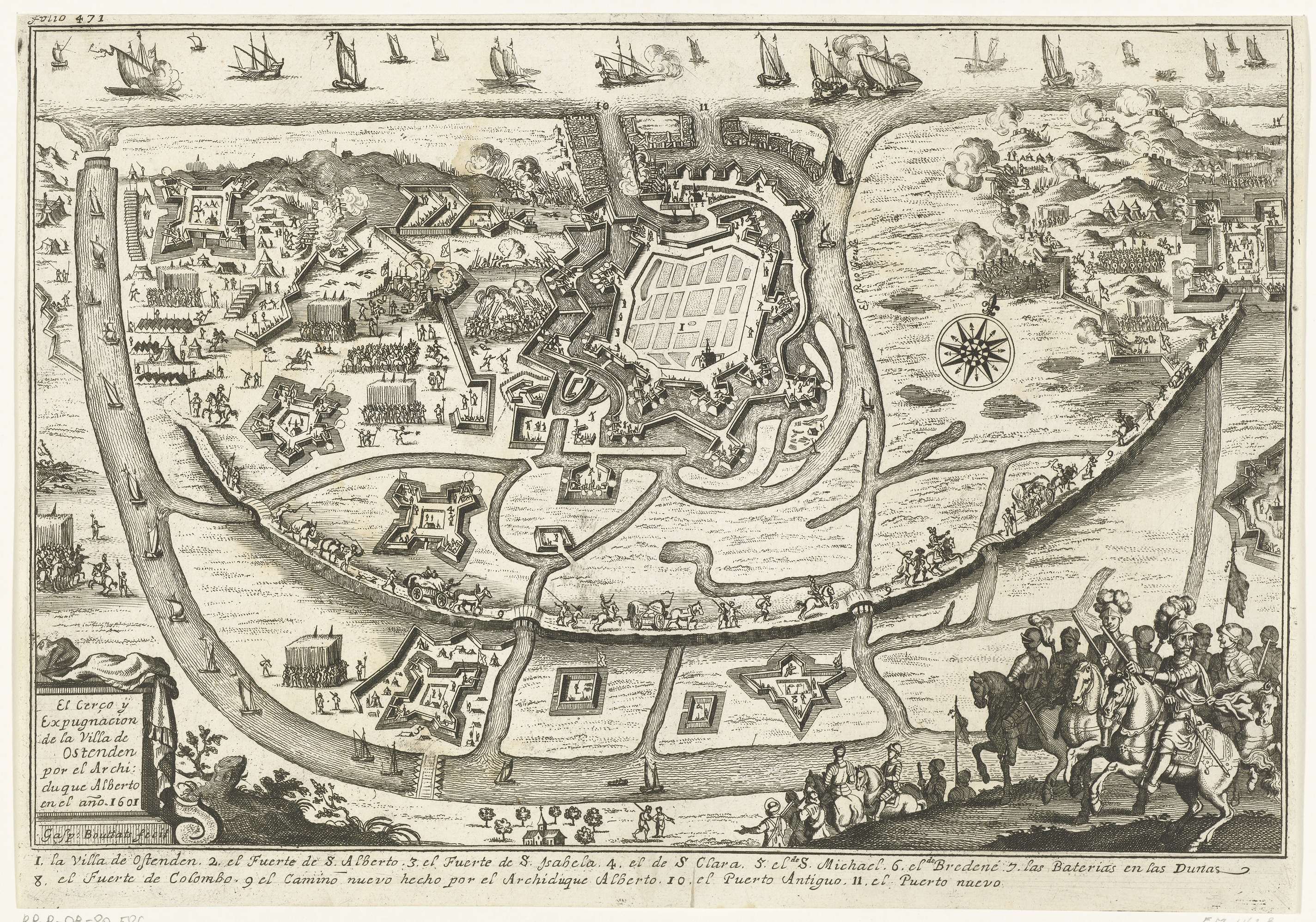Beleg van Oostende door het Spaanse leger onder Albrecht en later onder Spinola van 1601-1604. Plan van de stad met het omliggende land met alle verdedigingswerken en de legerkampen van de belegeraars. Linksonder een cartouche met de titel en signatuur. Rechts op de voorgrond Spaanse ruiters. In het onderschrift de legenda 1-11 in het Spaans.