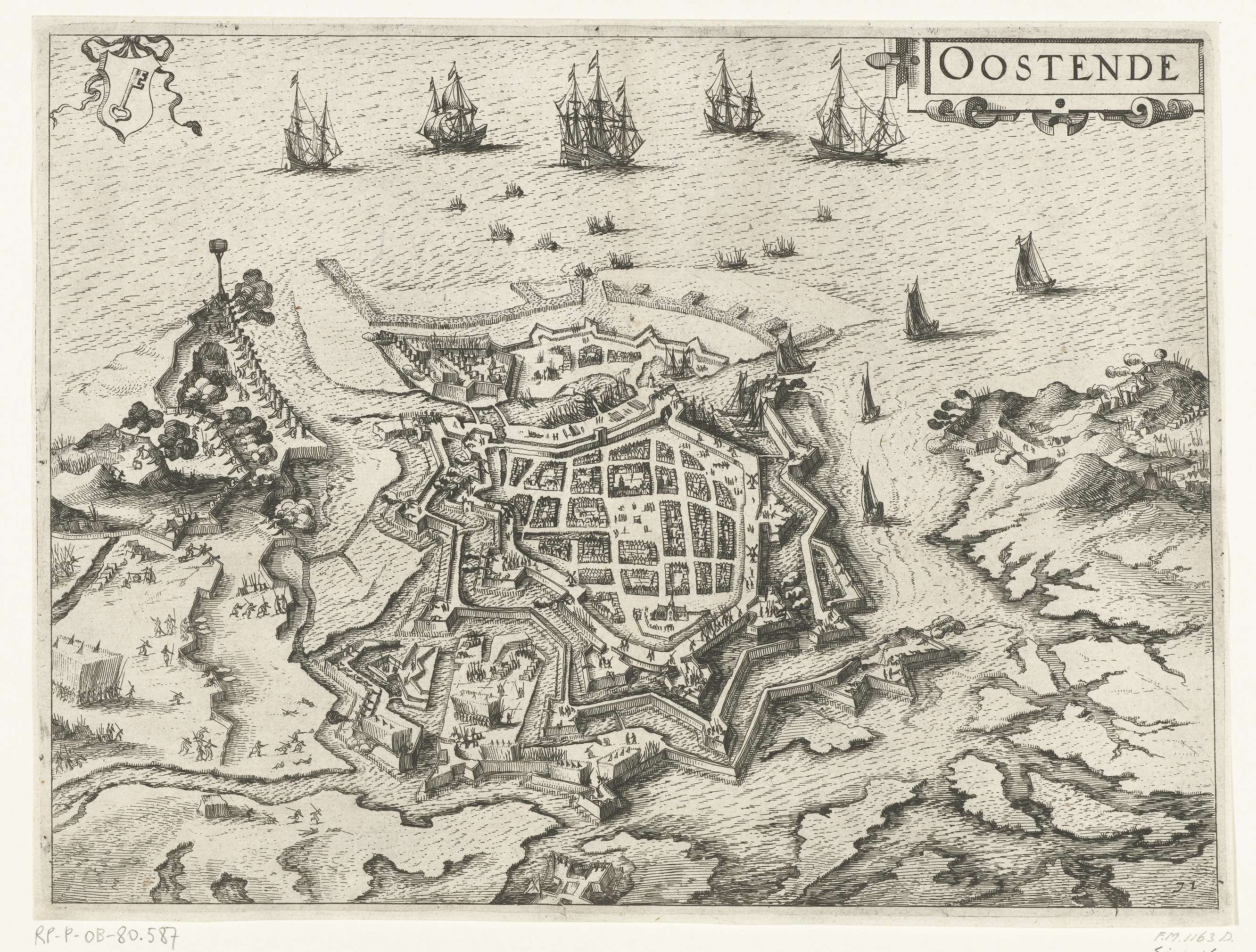 Beleg van Oostende door het Spaanse leger onder Albrecht en later onder Spinola van 1601-1604. Plattegrond van de stad met het omliggende land met alle verdedigingswerken en de legerkampen van de belegeraars, in vogelvluchtperspectief. Rechtsboven een cartouche met de titel, linksboven het stadswapen. Rechtsonder genummerd: 71.