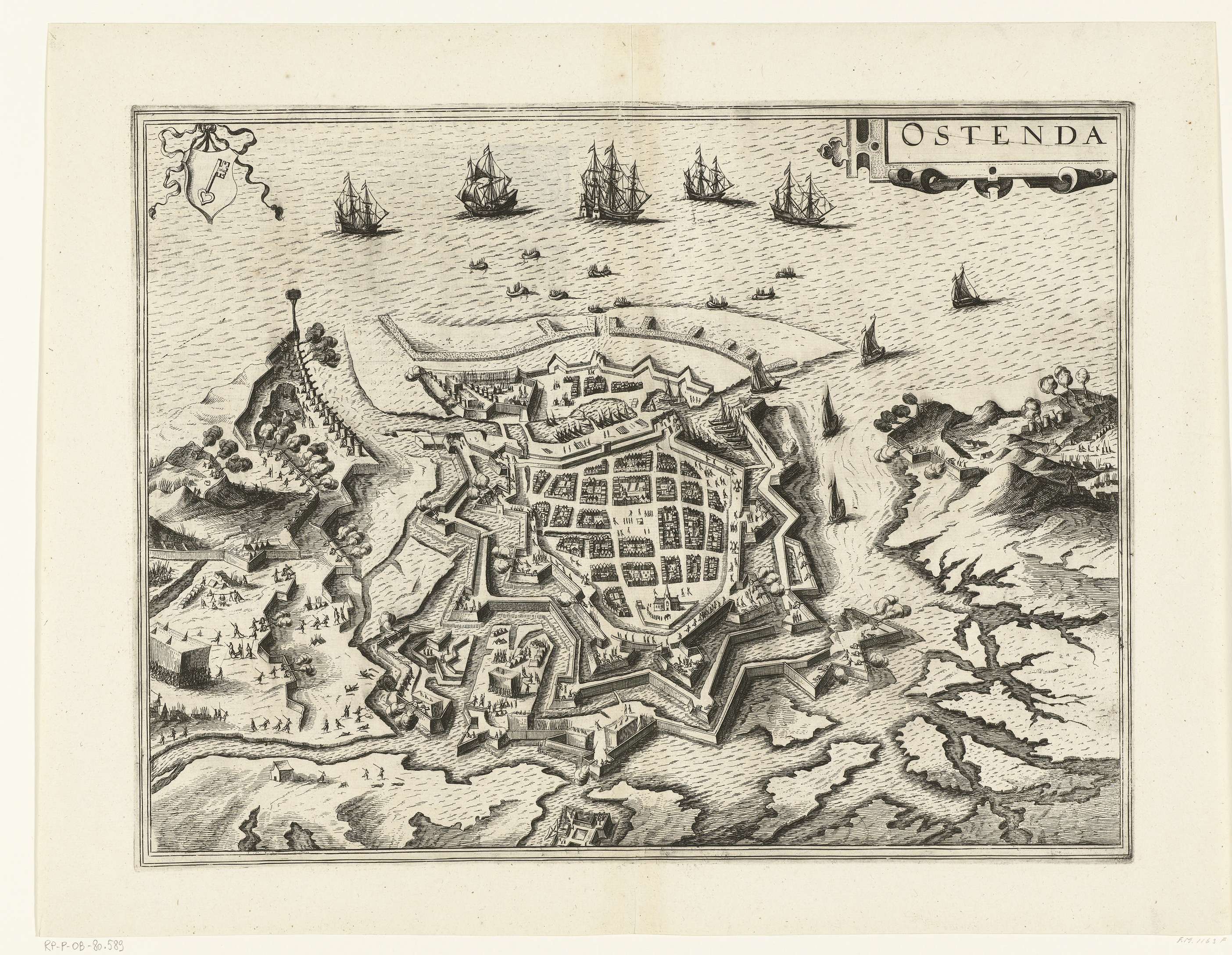 Beleg van Oostende door het Spaanse leger onder Albrecht en later onder Spinola van 1601-1604. Plan van de stad met het omliggende land met alle verdedigingswerken en de legerkampen van de belegeraars. Rechtsboven een cartouche met de titel, linksboven het stadswapen. Op een dubbelblad bedrukt met Latijnse tekst op de achterzijde, genomen uit de atlas ...