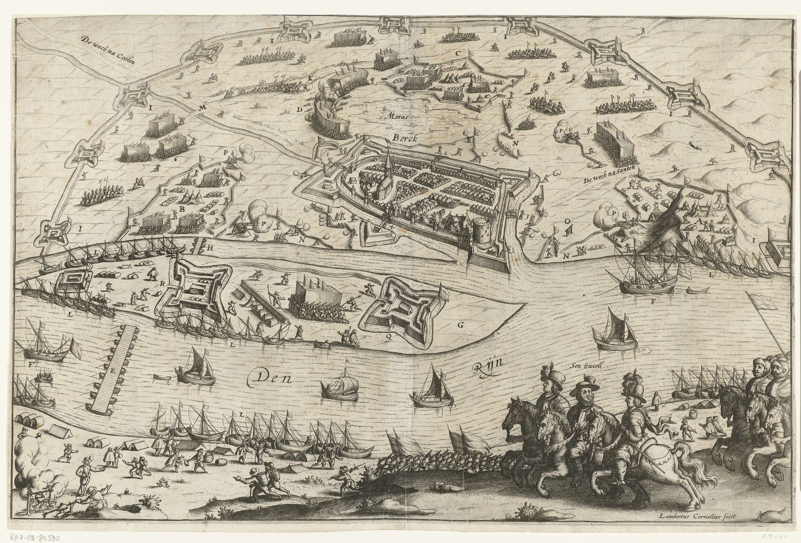 Belegering vanaf 12 juni en verovering op 31 juli 1601 van de stad Rheinberg door het Staatse leger onder prins Maurits. Plan van de stad en het omliggende land met alle schansen, het eiland in de Rijn met de schipbrug. Op de voorgrond een groepje van drie ruiters waaronder Maurits. Details in de voorstelling aangeduid ...
