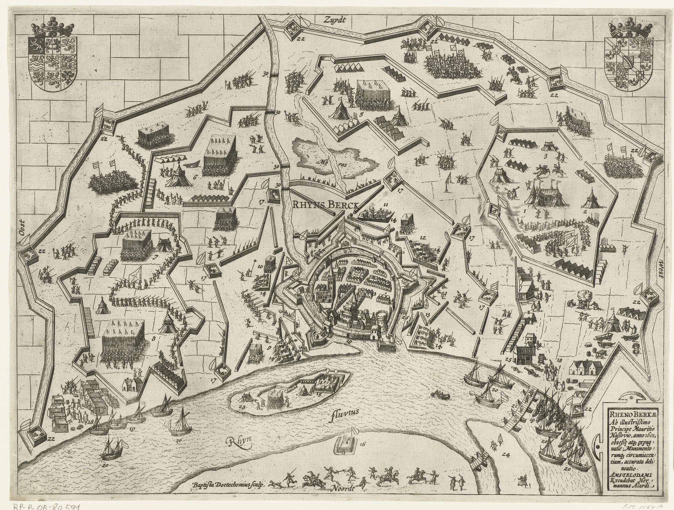 Belegering vanaf 12 juni en verovering op 31 juli 1601 van de stad Rheinberg door het Staatse leger onder prins Maurits. Plan van de stad en het omliggende land met alle schansen, het eiland in de Rijn met de schipbrug. Bovenaan de wapens van de Staten-Generaal (links) en Maurits (rechts). Details in de voorstelling aangeduid ...