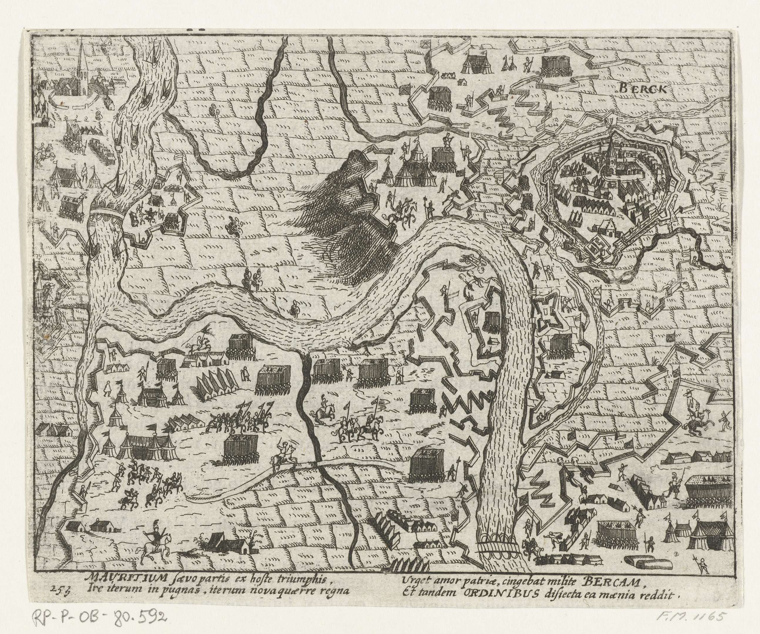 Belegering vanaf 12 juni en verovering op 31 juli 1601 van de stad Rheinberg door het Staatse leger onder prins Maurits. Plan van de stad en het omliggende land met de legerkampen van de belegeraars. Met onderschrift van 4 regels in het Latijn. Genummerd 253. Bedrukt op achterzijde met tekst in het Latijn.