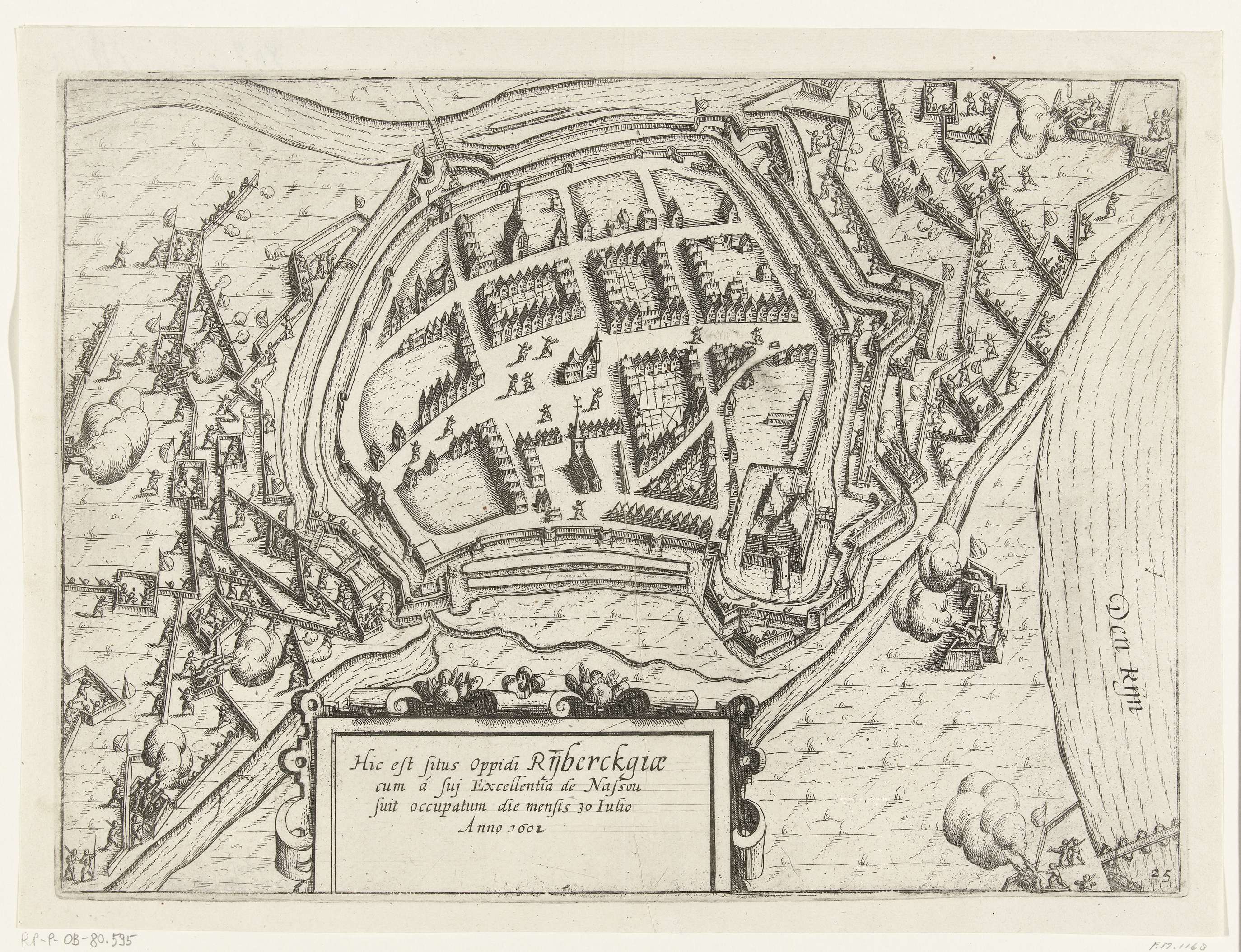 Rheinberg tijdens de belegering vanaf 12 juni en verovering op 31 juli 1601 door het Staatse leger onder prins Maurits. Plan van de stad en de verdedigingswerken. Middenonder een cartouche met de titel in het Latijn. Rechts de Rijn. Genummerd rechtsonder: 25.
