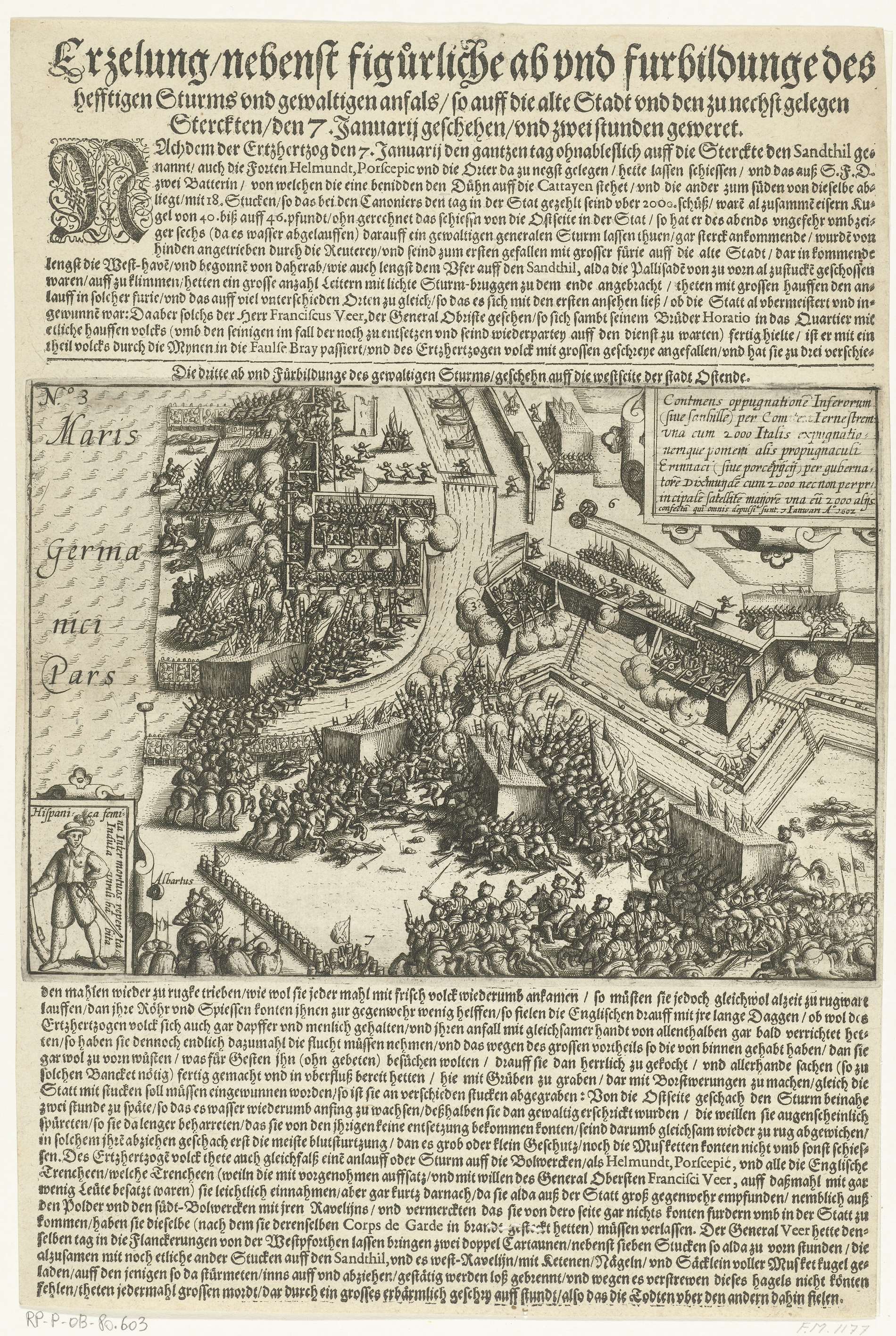 Zware bestorming van de verdedigingswerken van Oostende door de Spaanse troepen onder Albrecht, 7 januari 1602. Linksonder een inzet met een een plaatje van een vrouwelijke Spaanse soldaat die bij de gevechten betrokken was, rechtsboven een cartouche met opschrift in het Latijn. Gedrukt op een blad met teksten in het Duits, onder en boven de ...