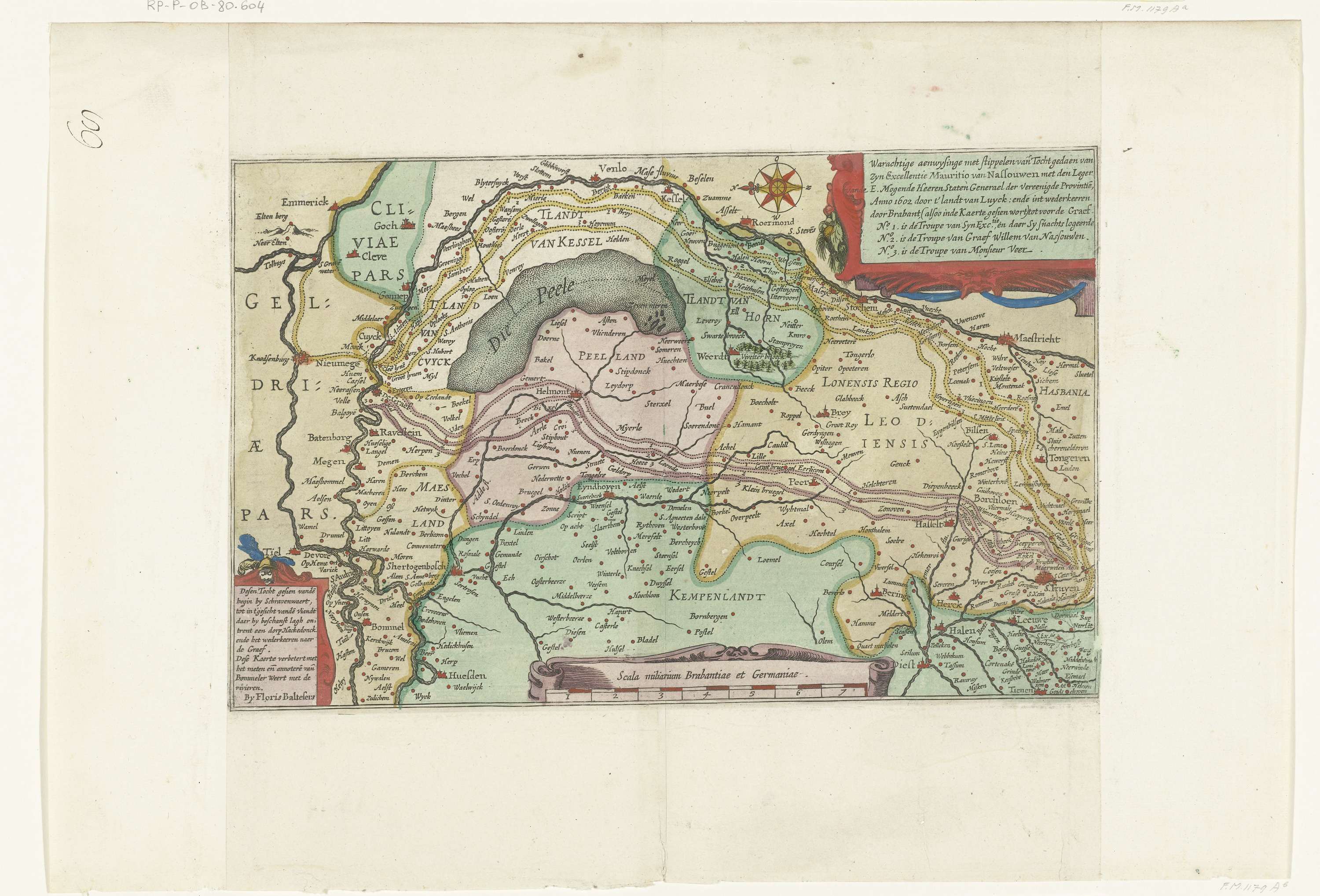 Kaart waarop de tocht van het Staatse Leger onder prins Maurits door Brabant is uitgestippeld, 7 juni - 18 juli 1602. Met twee cartouches met opschriften en titel in het Nederlands. Onder een schaalstok: 7 Scala miliarium Brabantiae et Germaniae.