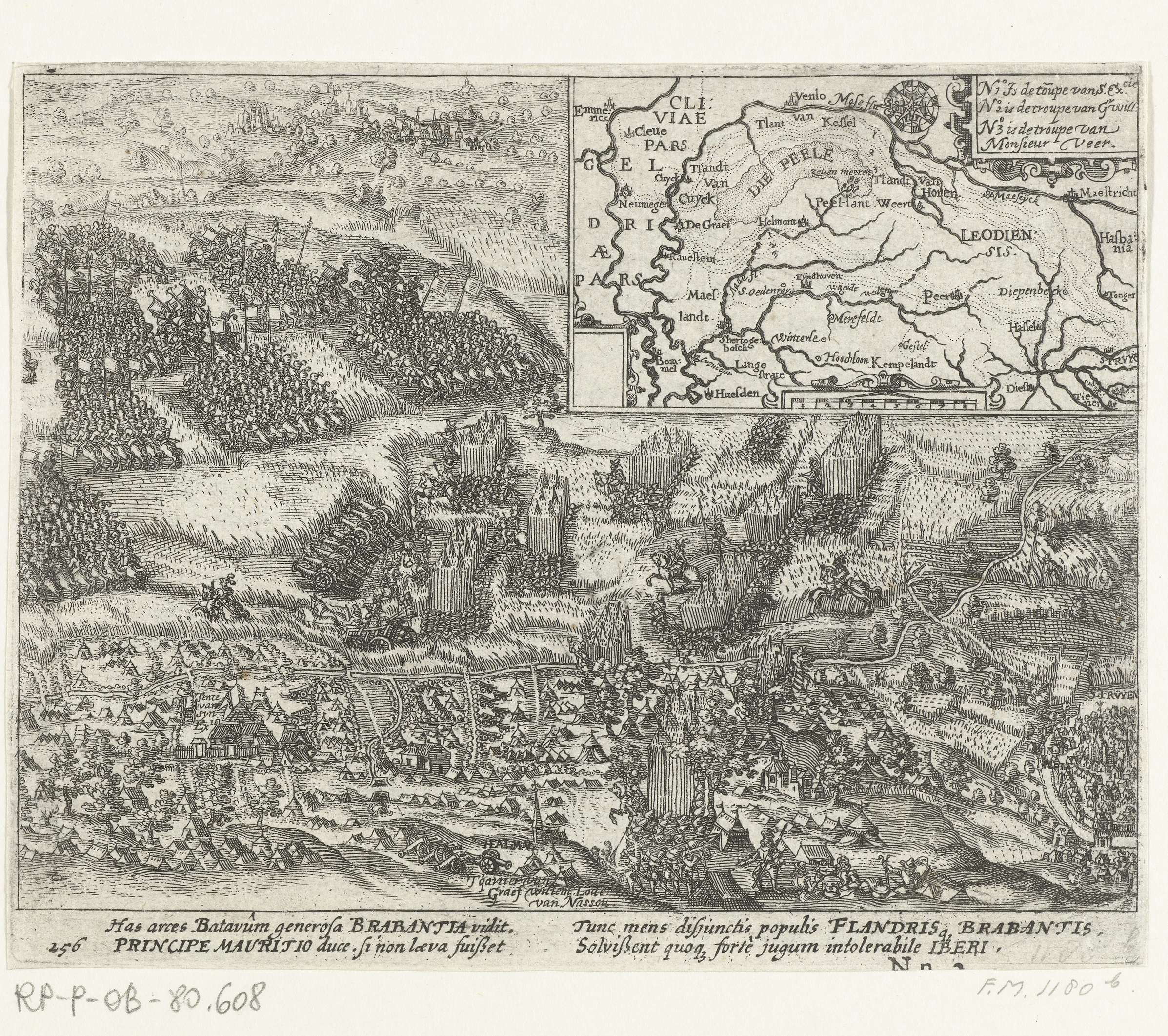 De tocht door Brabant: het Staatse Leger onder prins Maurits voor Tienen, 7 juli 1602. Rechterhelft van geheel van twee bladen. Op de voorgrond het kwartier van graaf Willem Lodewijk van Nassau, rechtsboven een inzet met een kaartje van het groter gebied. Met onderschrift van twee regels in het Latijn, genummerd: 256. Bedrukt op achterzijde ...