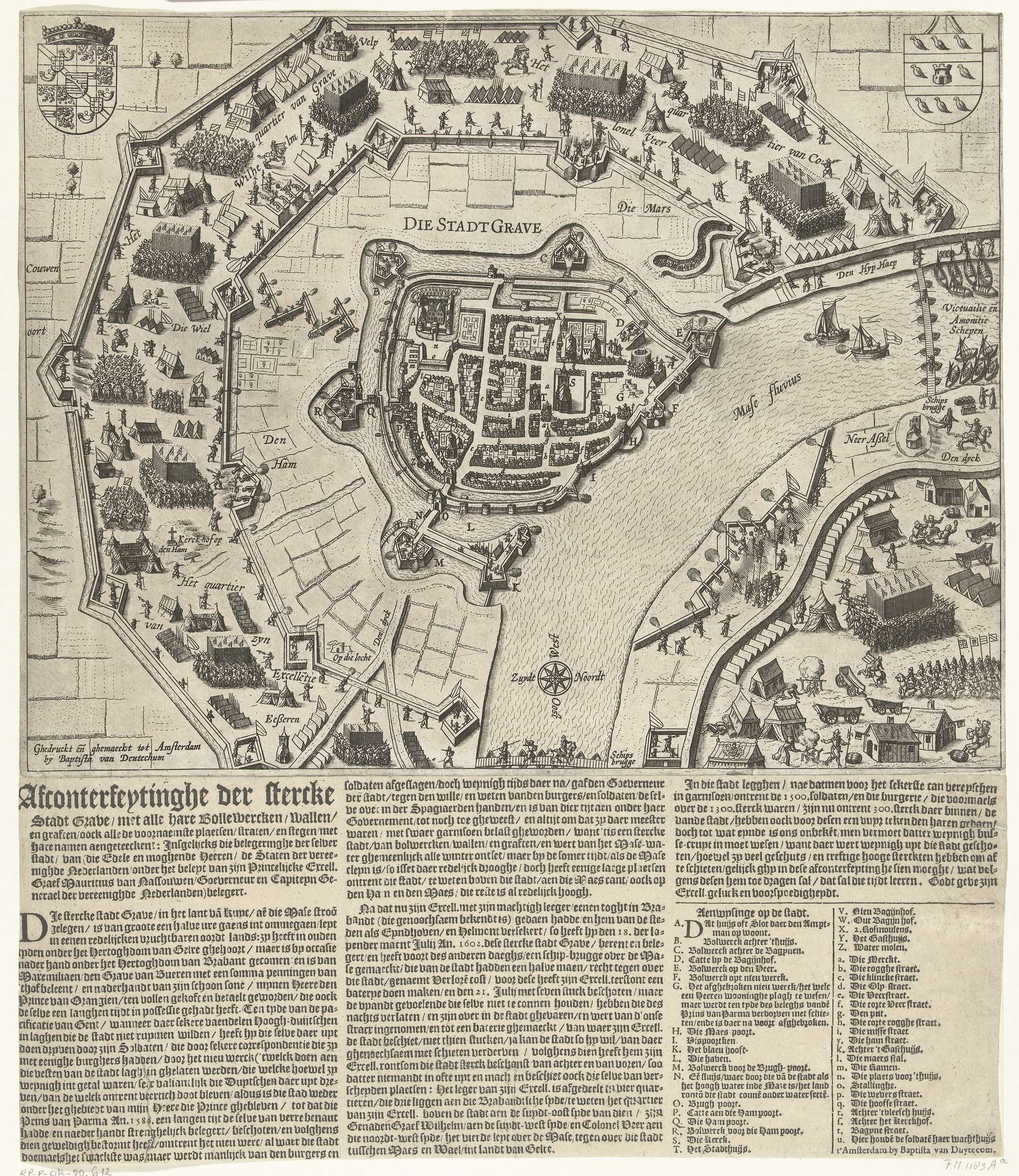 Beleg en inname van de stad Grave door het Staatse leger onder prins Maurits, 18 juli - 20 september 1602. Kaart van Grave met de omsingeling door de troepen van de prins. Linksboven het wapen van de Staten-Generaal, rechtsboven het stadswapen van Grave. Apart gedrukt onder de voorstelling een Nederlandse tekst in 3 kolommen, met ...