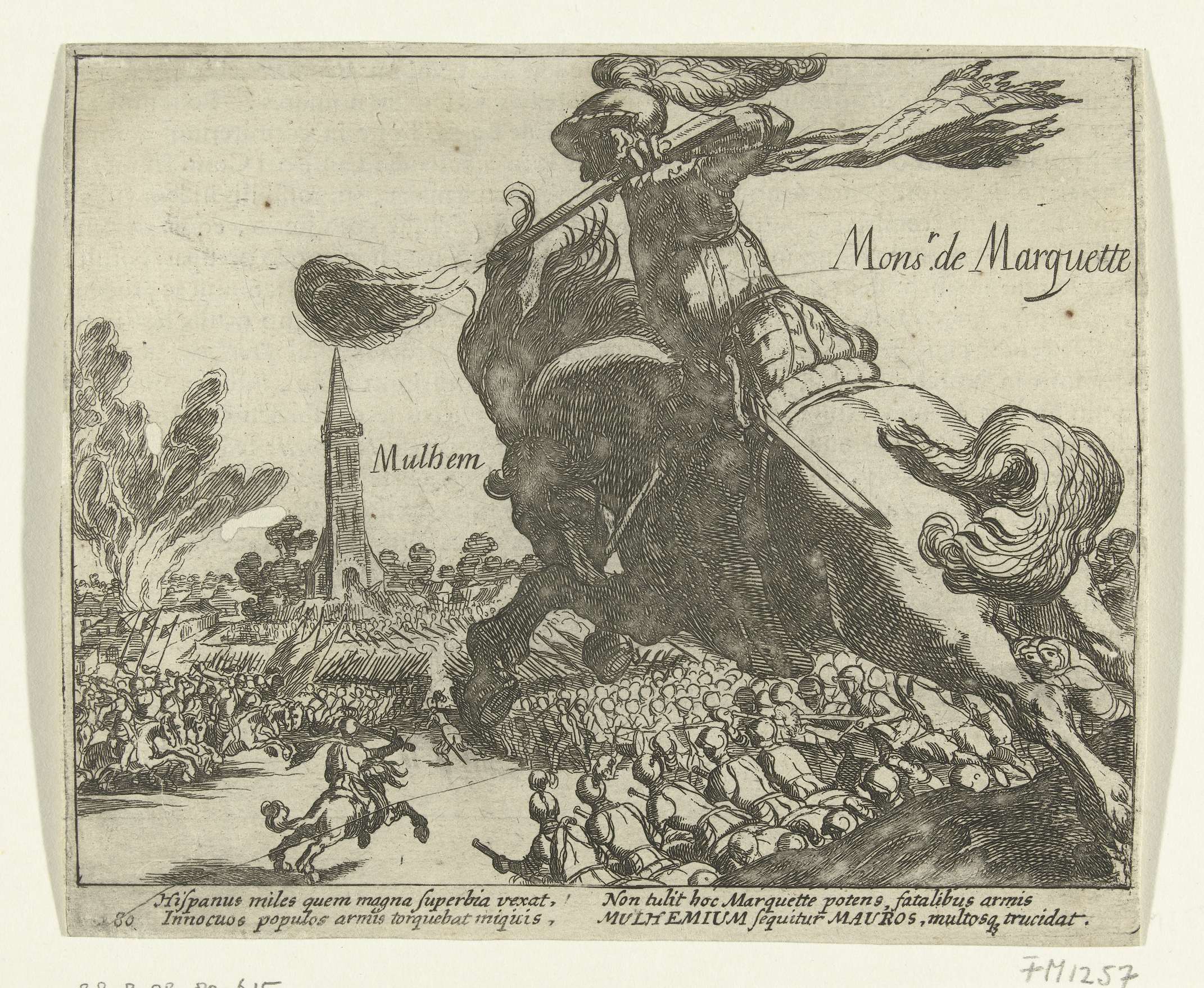 Spanjaarden verslagen door het Staatse leger onder Marquette bij Mülheim, 1608. Op de voorgrond een ruiter die zijn musket vuurt. Met onderschrift van 4 regels in het Latijn. Genummerd: 280. Bedrukt op achterzijde met tekst in het Latijn.