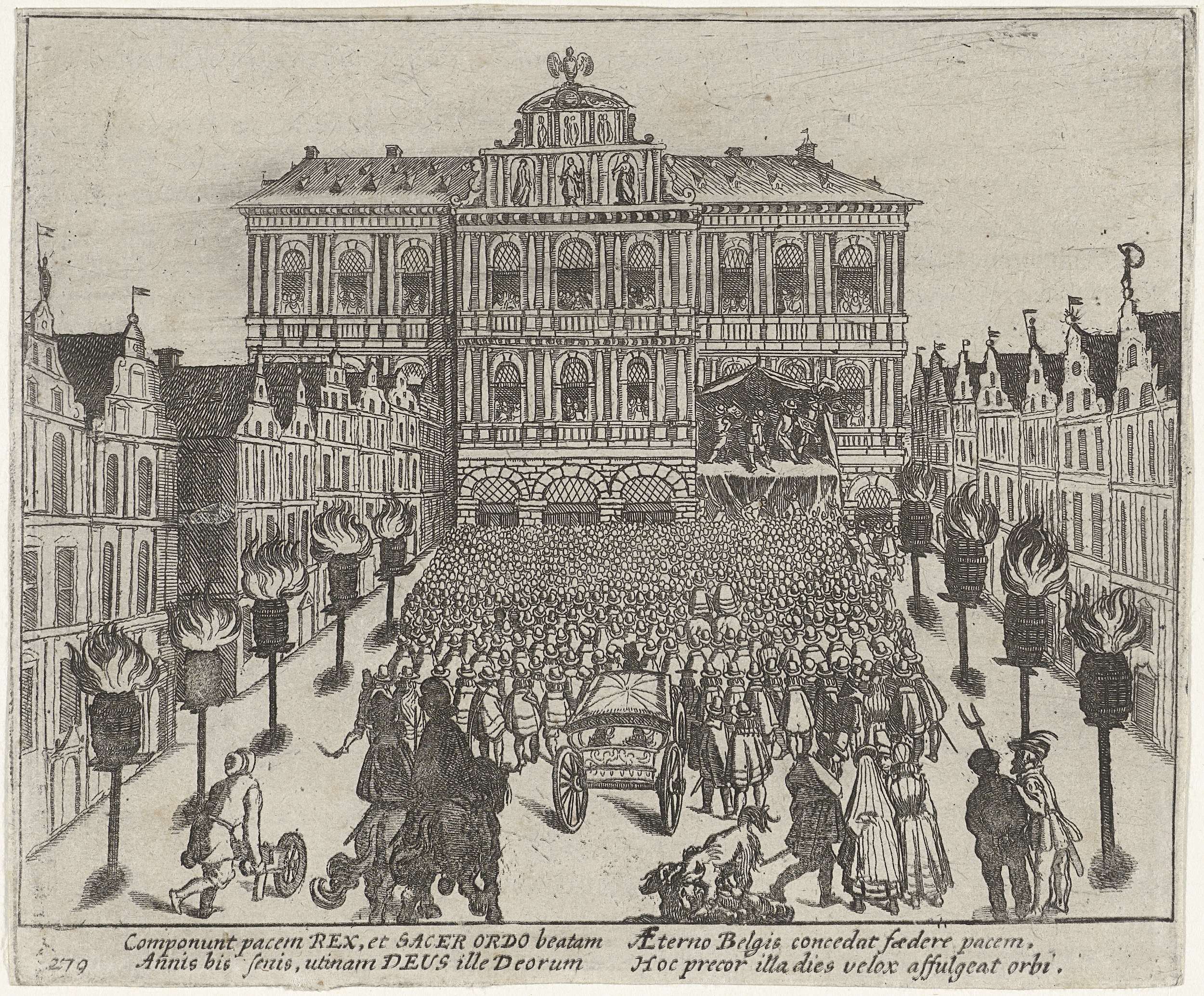 Afkondiging van het Twaalfjarig Bestand te Antwerpen, 14 april 1609. Het nieuws wordt voorgelezen vanaf een podium opgesteld voor het stadhuis. Op de Grote Markt is een grote menigte toegestroomd, links en rechts vreugdevuren. Met onderschrift van 4 regels in het Latijn. Genummerd: 279. Bedrukt op achterzijde met tekst in het Latijn.