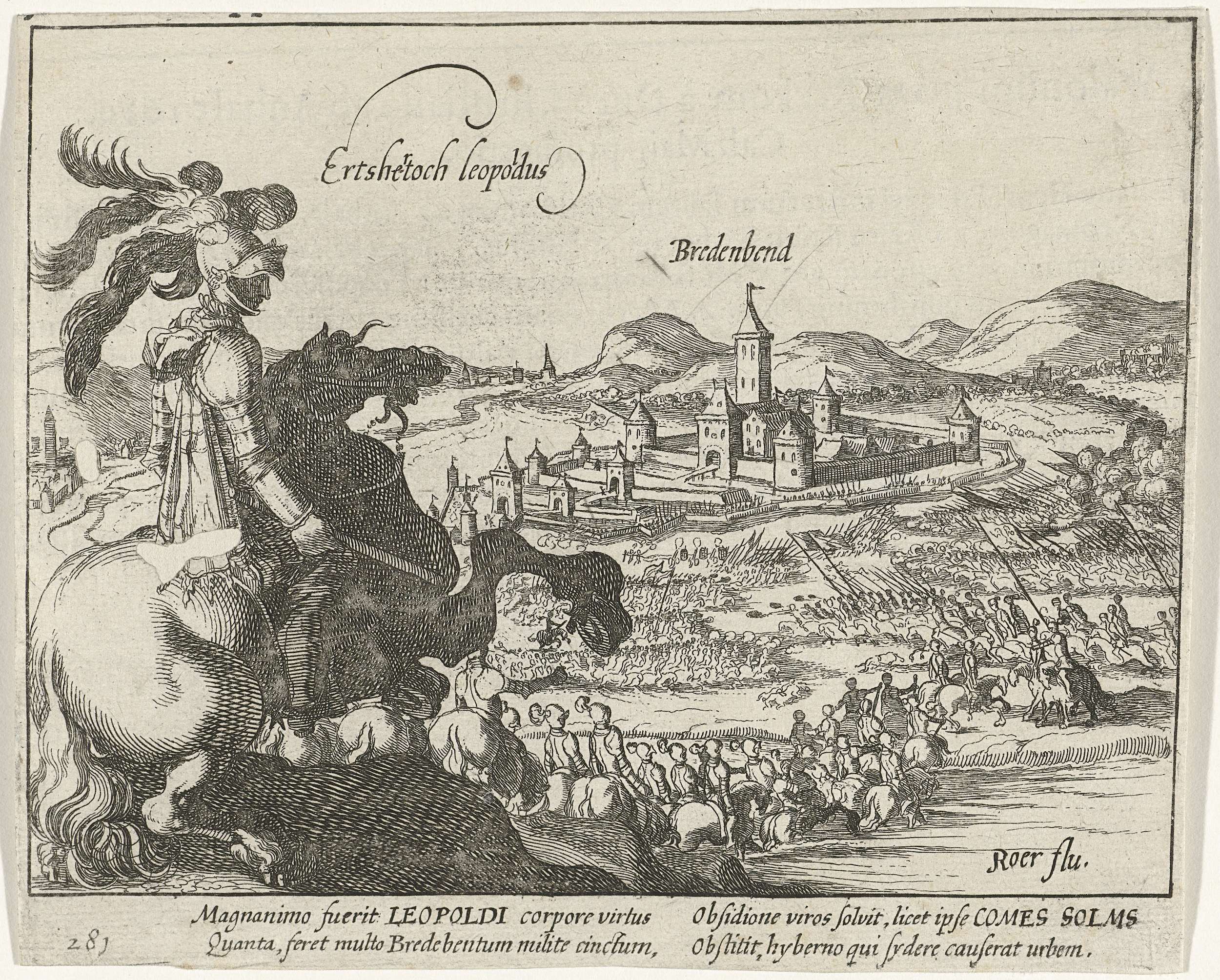 Aartshertog Leopold ontzet Breitenbend, 12 maart 1610. Op de voorgrond ziet de aartshertog te paard hoe zijn leger de rivier de Ruhr doorsteekt op weg naar de stad Breitenbend, dat door het Staatse leger belegerd wordt. Met onderschrift van 4 regels in het Latijn. Genummerd: 281. Bedrukt op achterzijde met tekst in het Latijn.