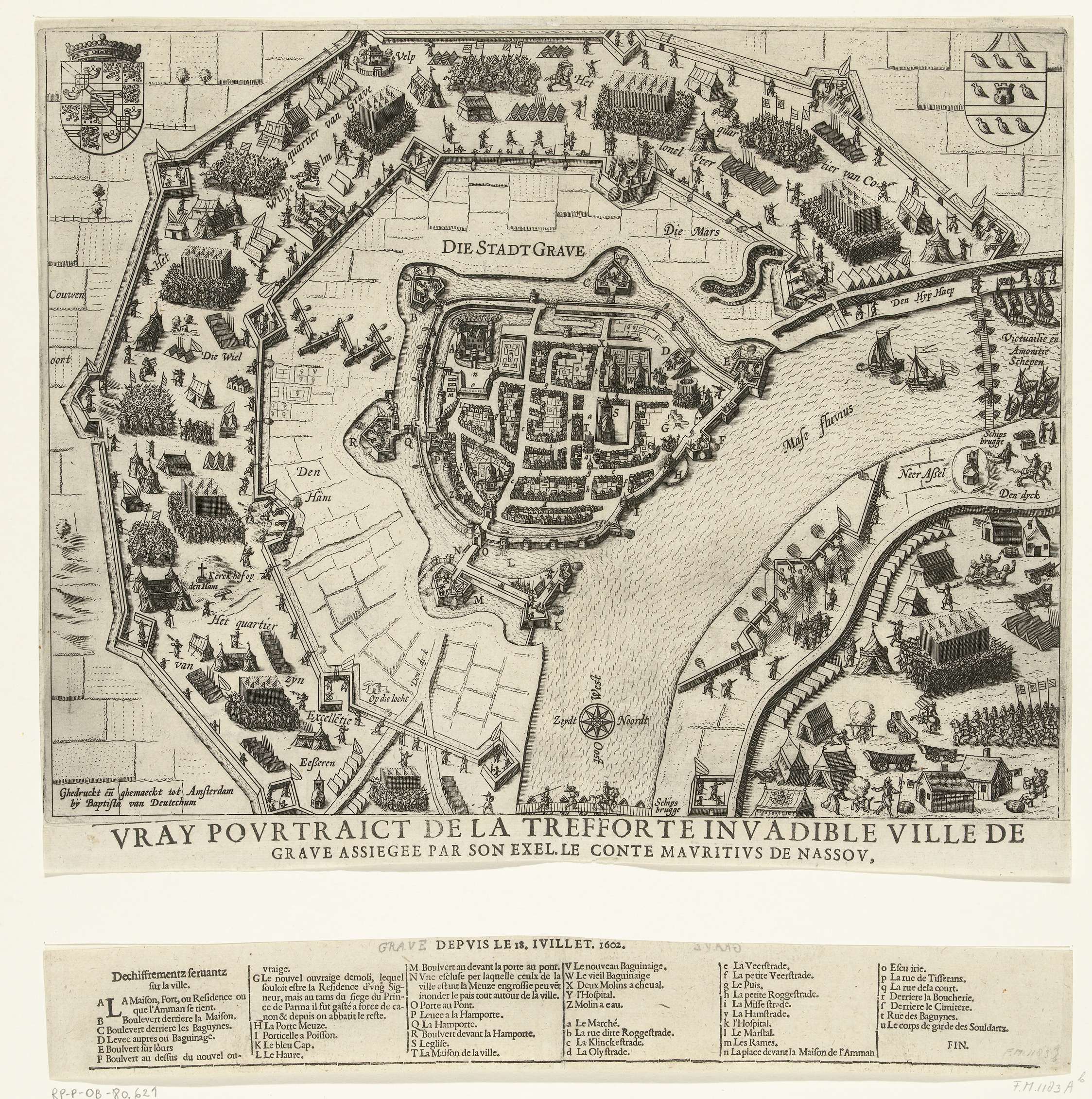 Beleg en inname van de stad Grave door het Staatse leger onder prins Maurits, 18 juli - 20 september 1602. Kaart van Grave met de omsingeling door de troepen van de prins. Linksboven het wapen van de Staten-Generaal, rechtsboven het stadswapen van Grave. De Franse titel onder de voorstelling geplakt, hierbij een los blad met ...