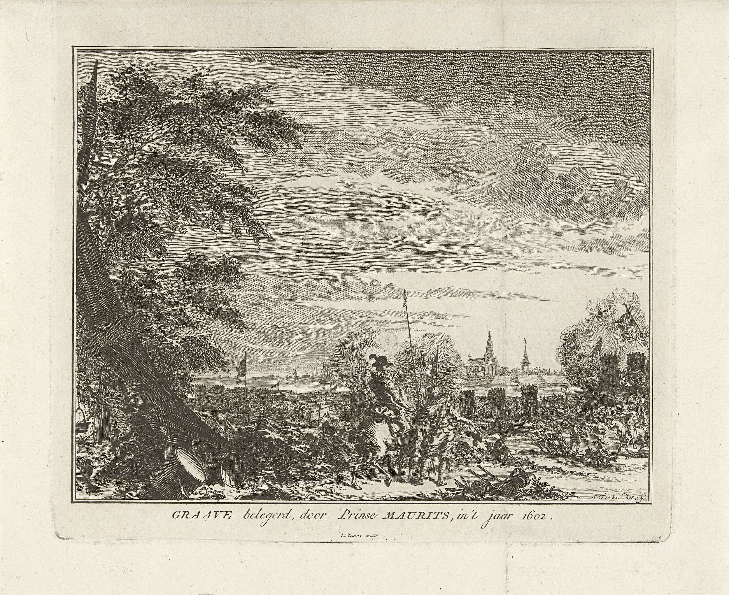 De stad Grave, belegerd en veroverd door het Staatse leger onder prins Maurits, 18 juli - 20 september 1602. De prins te paard in het legerkamp, in de verte het profiel van de stad.