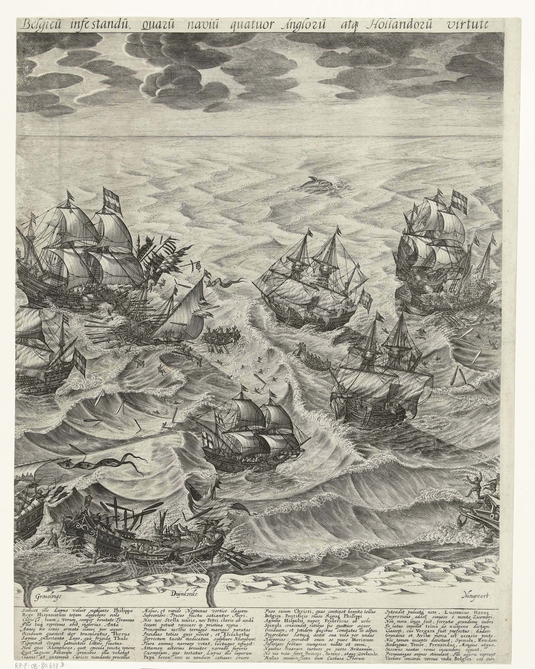 De vernietiging van de Spaanse galeien in het Kanaal voor de Vlaamse kust door de Staatse vloot onder vice-admiraal Jacob van Duivenvoorde, heer van Obdam, 3 oktober 1602. Grote voorstelling bestaande uit drie bladen. Middenblad: verschillende galeien worden aangevallen, de bemanning springt overboord; onderaan de Vlaamse kust bij de steden Grevelingen, Duinkerke en Nieuwpoort. Met ...