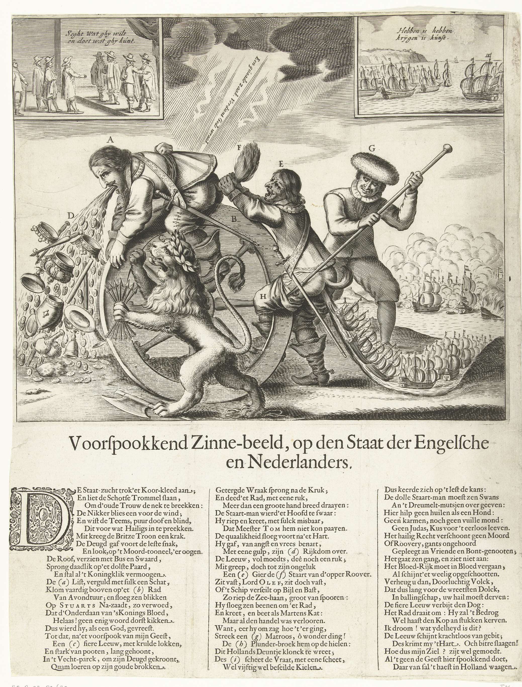 Spotprent op de Engelsen, 1652. Oliver Cromwell en een andere Engelsman (admiraal Blake?) liggend op het rad van Fortuin gedraaid door de Hollandse Matroos en de Nederlandse Leeuw. Uit de mond van Cromwell worden de geroofde rijkdommen gespuugd, bij de ander wordt een vloot van oorlogsschepen uitgescheten. Op de achtergrond een zeeslag. Bovenin twee kleine ...