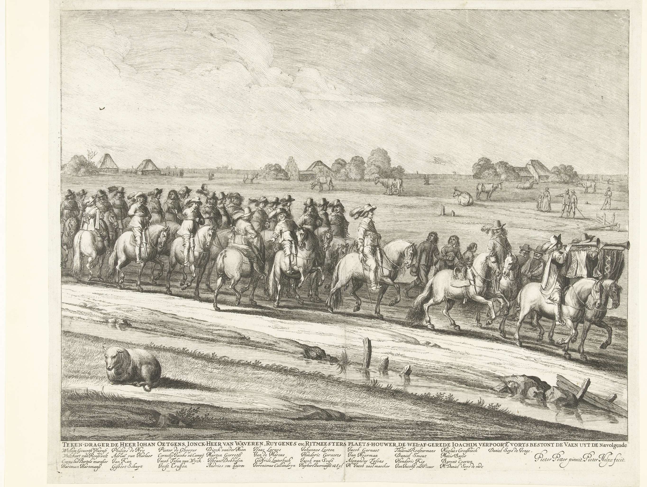 Optocht van de schutters langs de Haarlemmertrekvaart bij de intocht van Engelse koningin Henrietta Maria te Amsterdam, 20 mei 1642. Geheel bestaande uit drie bladen: rechterblad. Het begin van de stoet voorafgegaan door trompetters. In het onderschrift een lijst in 10 kolommen met een deel van de namen van de ruiters in de stoet.