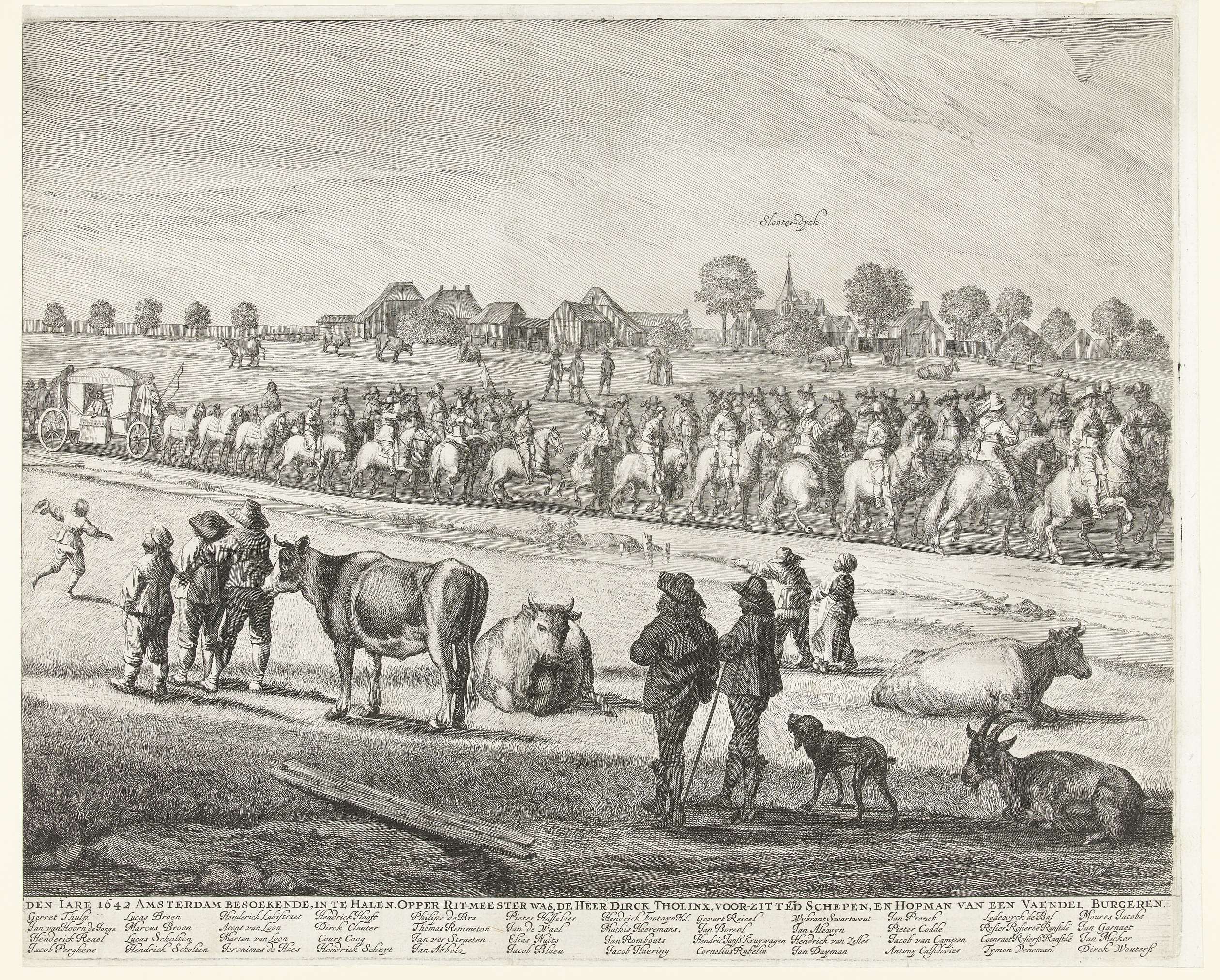 Optocht van de schutters langs de Haarlemmertrekvaart bij de intocht van Engelse koningin Henrietta Maria te Amsterdam, 20 mei 1642. Geheel bestaande uit drie bladen: middenblad. De stoet met een rijtuig begeleid door ruiters trekt langs Sloterdijk. Op de voorgrond toeschouwers en vee. In het onderschrift een lijst in 12 kolommen met een deel van ...