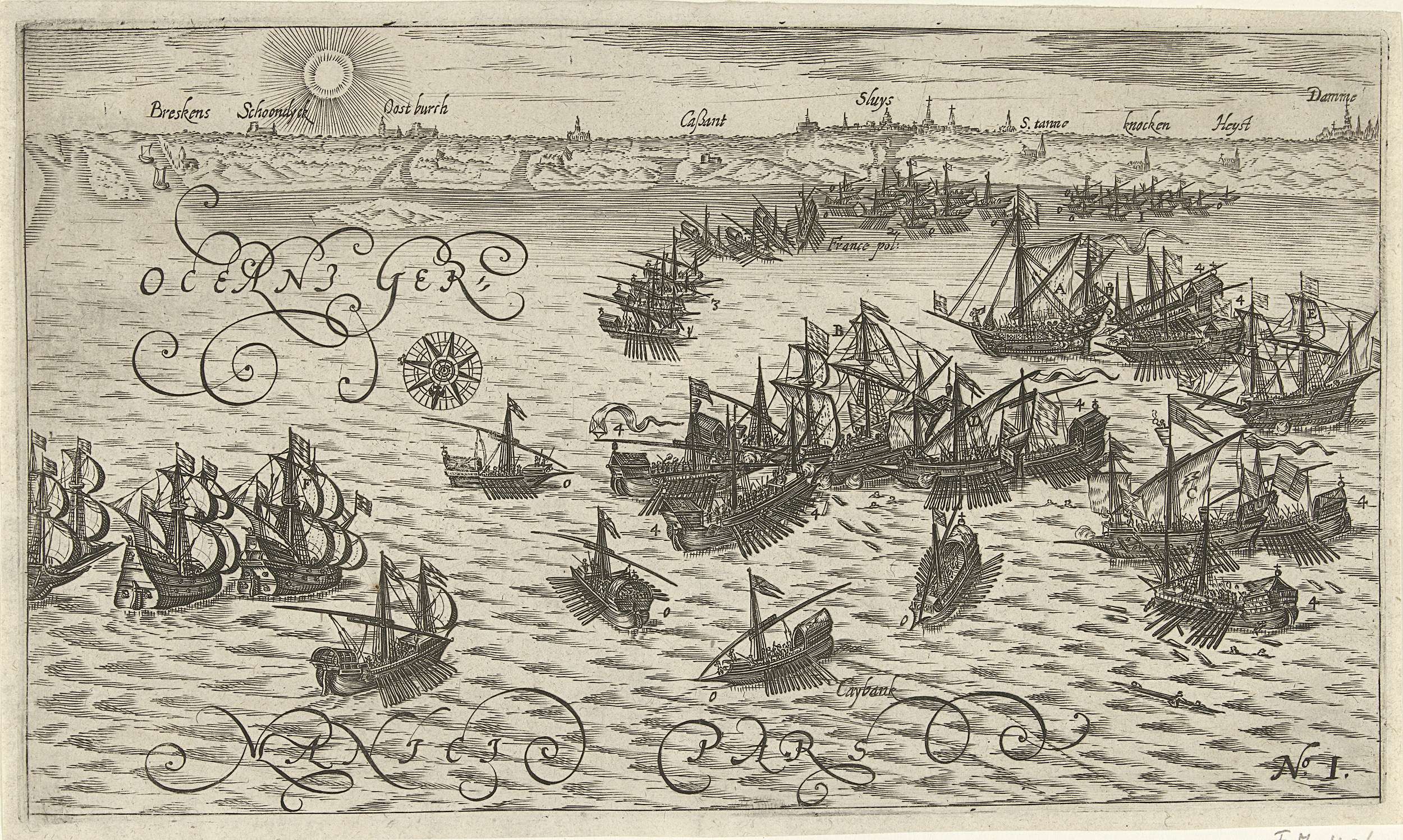 De zeeslag voor de kust bij Sluis waarbij de acht Spaanse galeien onder Federico Spinola (die stierf bij deze zeeslag) worden verslagen door de Staatse vloot van drie schepen en twee galeien onder Joos de Moor, 26 mei 1603. Boven in de verte de kust van de Westerschelde met de steden Breskens, Schoondijke, Oostburg, Sluis, ...