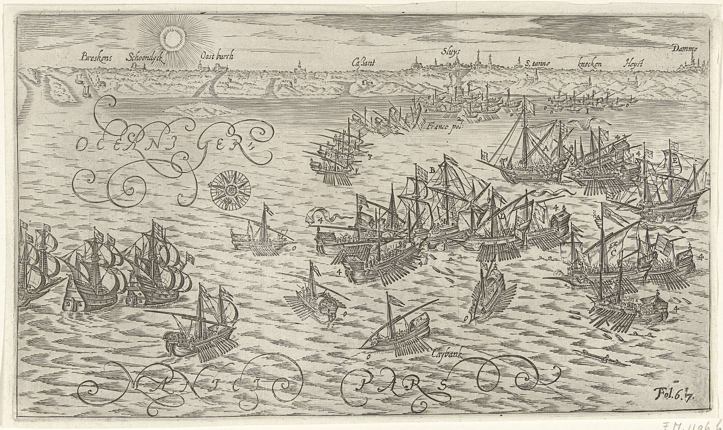De zeeslag voor de kust bij Sluis waarbij de acht Spaanse galeien onder Federico Spinola (die stierf bij deze zeeslag) worden verslagen door de Staatse vloot van drie schepen en twee galeien onder Joos de Moor, 26 mei 1603. Boven in de verte de kust van de Westerschelde met de steden Breskens, Schoondijke, Oostburg, Sluis, ...
