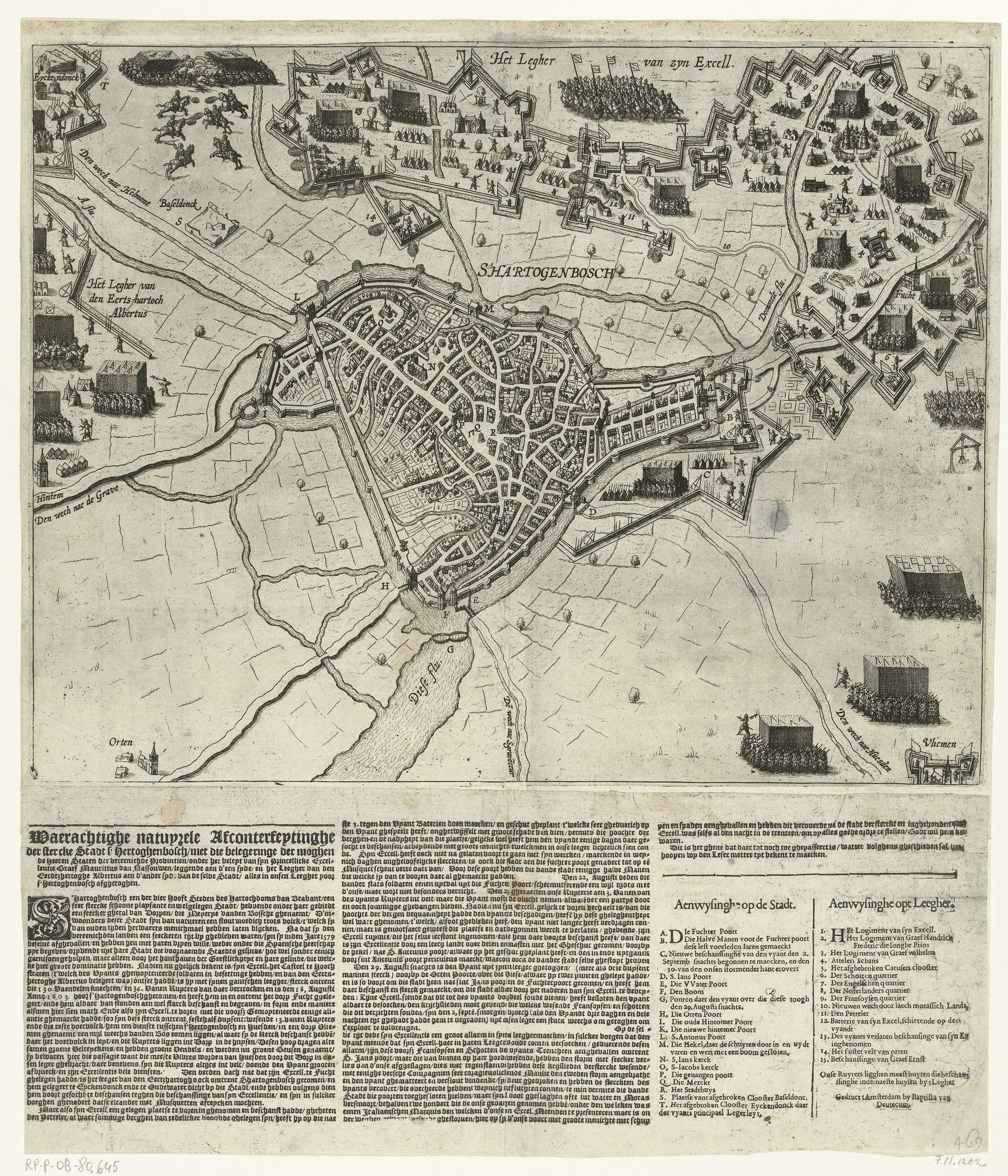 's-Hertogenbosch tevergeefs belegerd door Maurits, 18 augustus-september 1603. Kaart van 's-Hertogenbosch en het omliggende land met bovenaan het legerkamp van het Staatse leger onder Maurits. Links het kwartier van het leger van aartshertog Albrecht. Vastgeplakt onder de prent een tekstblad met 3 kolommen tekst en legenda's A-T en 1-15 in het Nederlands.