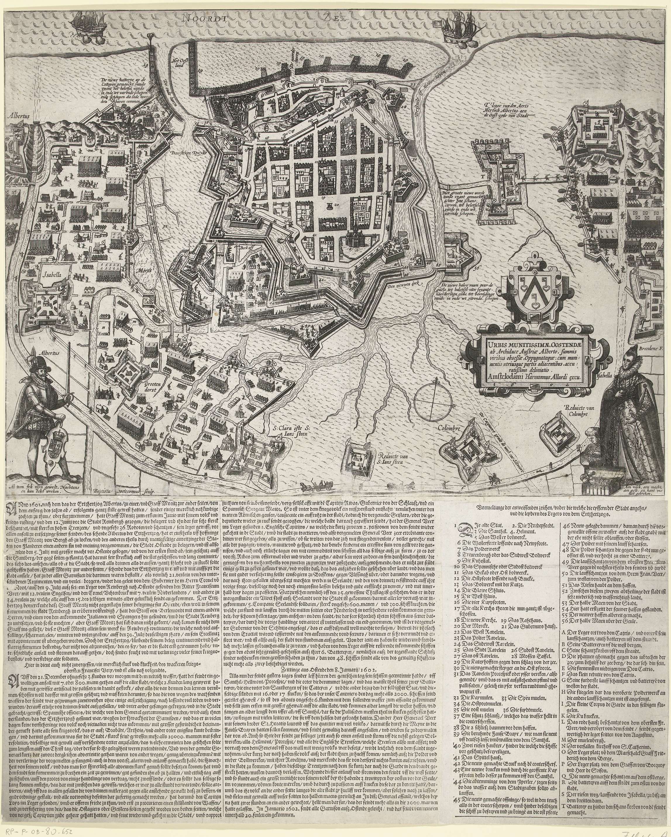Beleg van Oostende door de Spaanse troepen onder Albrecht in de jaren, 1601-1602. Kaart van de stad met de verdedigingswerken. Bovenaan de zee. Onderaan links en rechts Albrecht en Isabella. Rechts een cartouche met de Latijnse titel en het stadswapen. Onderaan vastgeplakt aan de prent een apart gedrukte beschrijving van het beleg tot aan 8 ...
