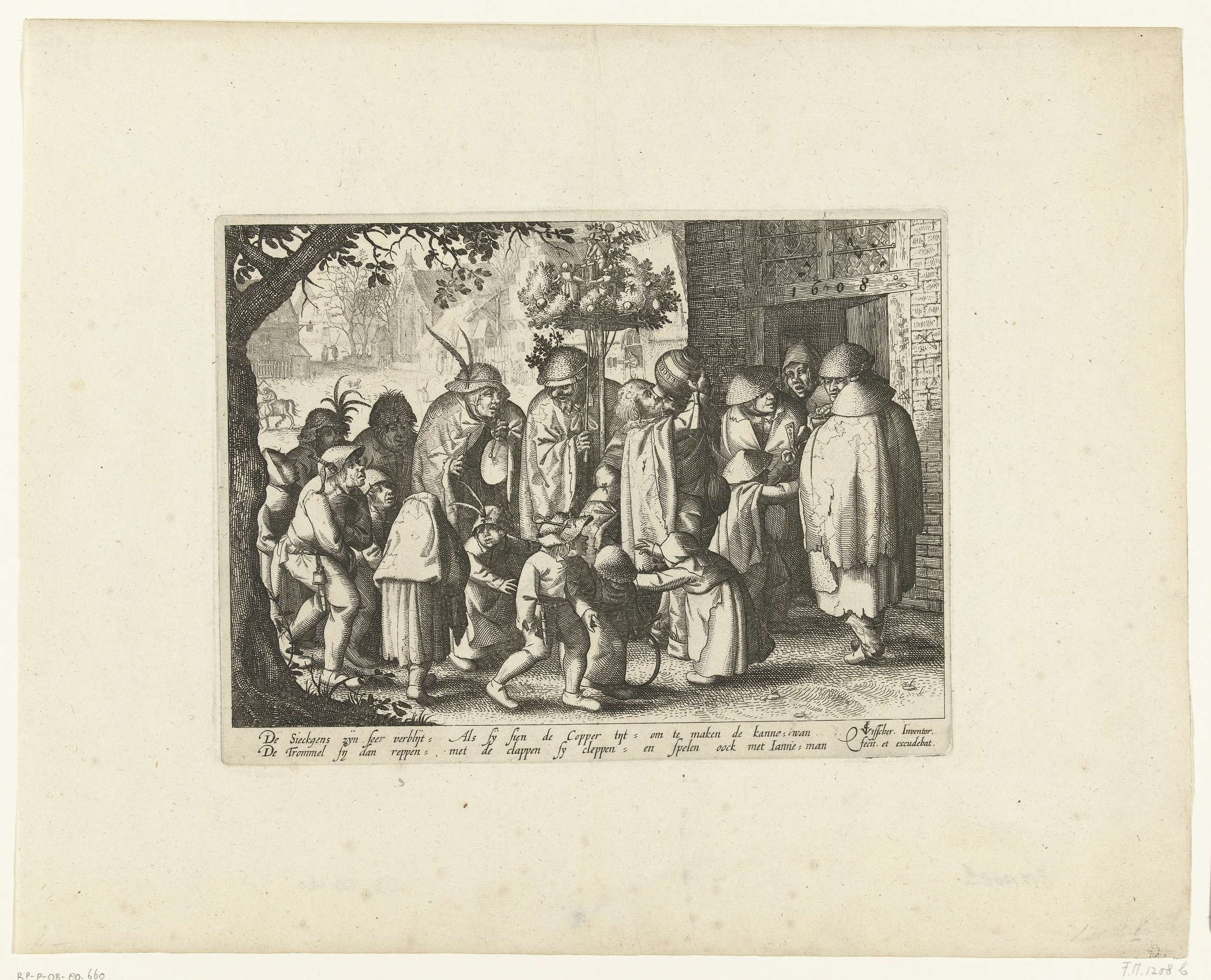 De jaarlijkse feestelijke optocht van de leprozen met kleppers op Koppermaandag (de eerste maandag na Driekoningen) houdt stil bij de deur van een huis in een dorp, ca. 1608. Op de voorgrond spelende kinderen, in de stoet een man met een trommel, een man die uit een kruik drinkt en een man met een soort ...