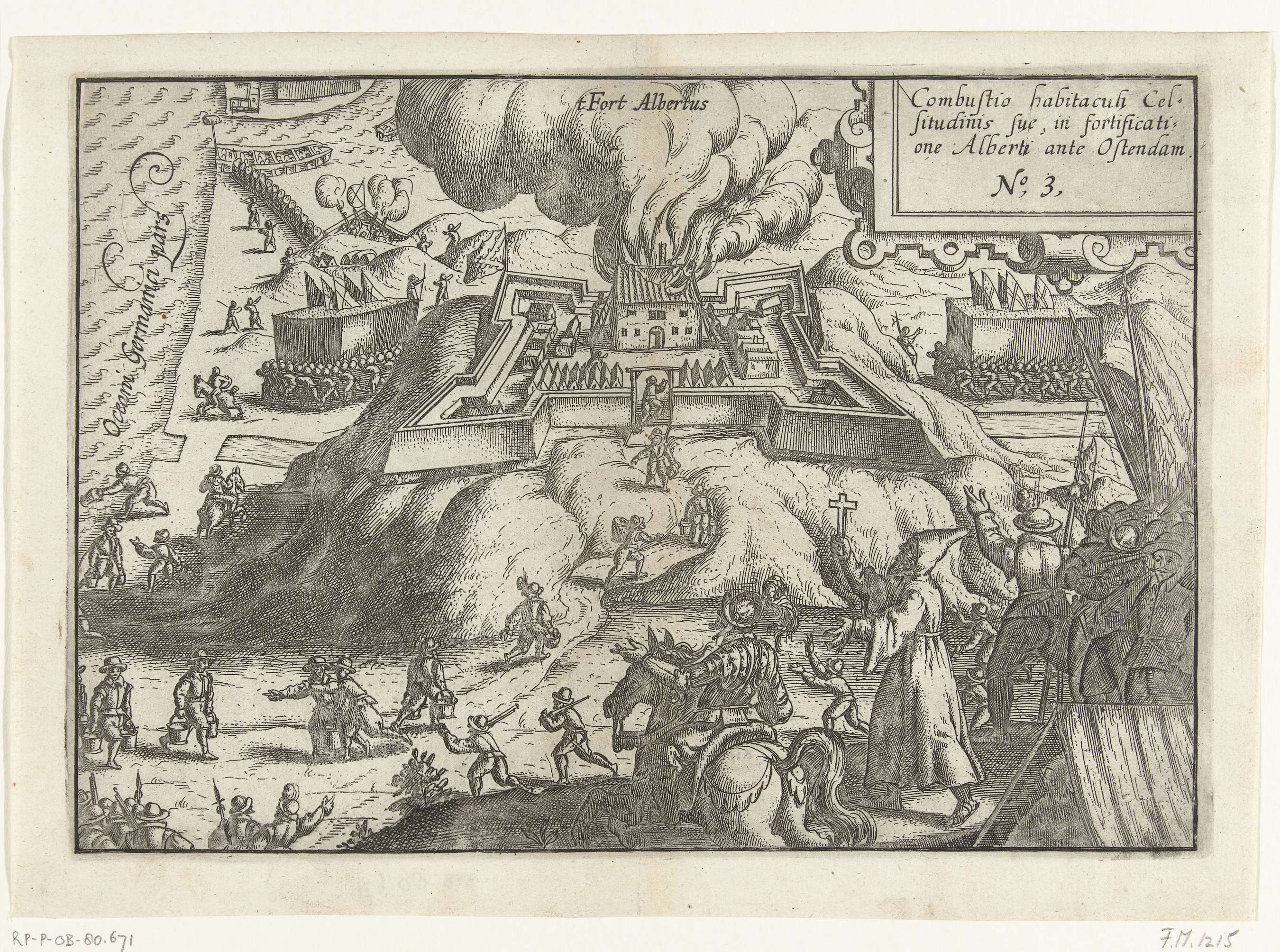 Beleg van Oostende: het afbranden van het logement van de aartshertog Albrecht gelegen in Fort Albertus, 13 november 1601. Op de voorgrond ontzetting onder de soldaten en bij een geestelijke met een crucifix. Rechtsboven een cartouche met opschrift in het Latijn. Rechtsboven genummerd: 3.