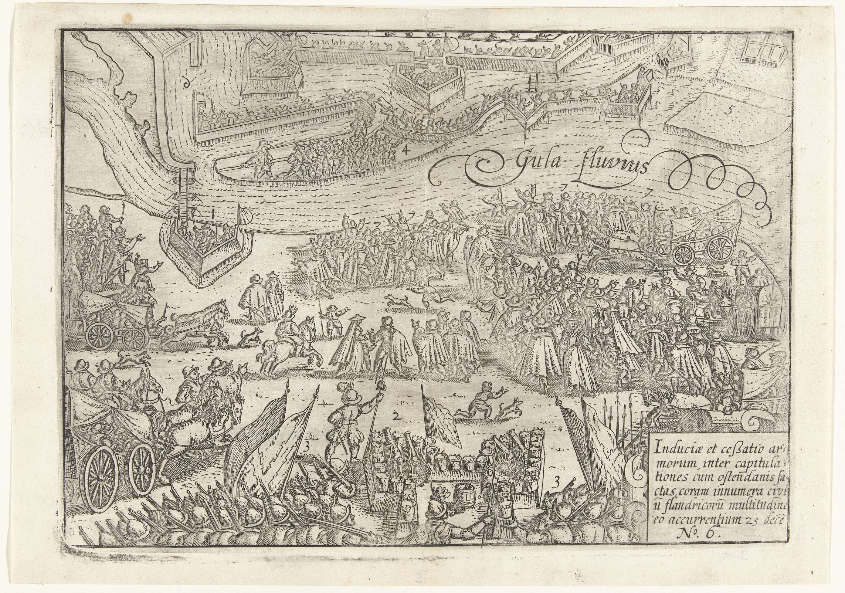 De vredesonderhandelingen op 23-25 december 1601 tussen het Staatse leger in de stad en de belegerende troepen van aartshertog Albrecht. Het volk heeft zich aan beide zijden van de vestingmuren en rivier verzameld. Rechtsonder een cartouche met opschrift in het Latijn. Rechtsonder genummerd: 6.