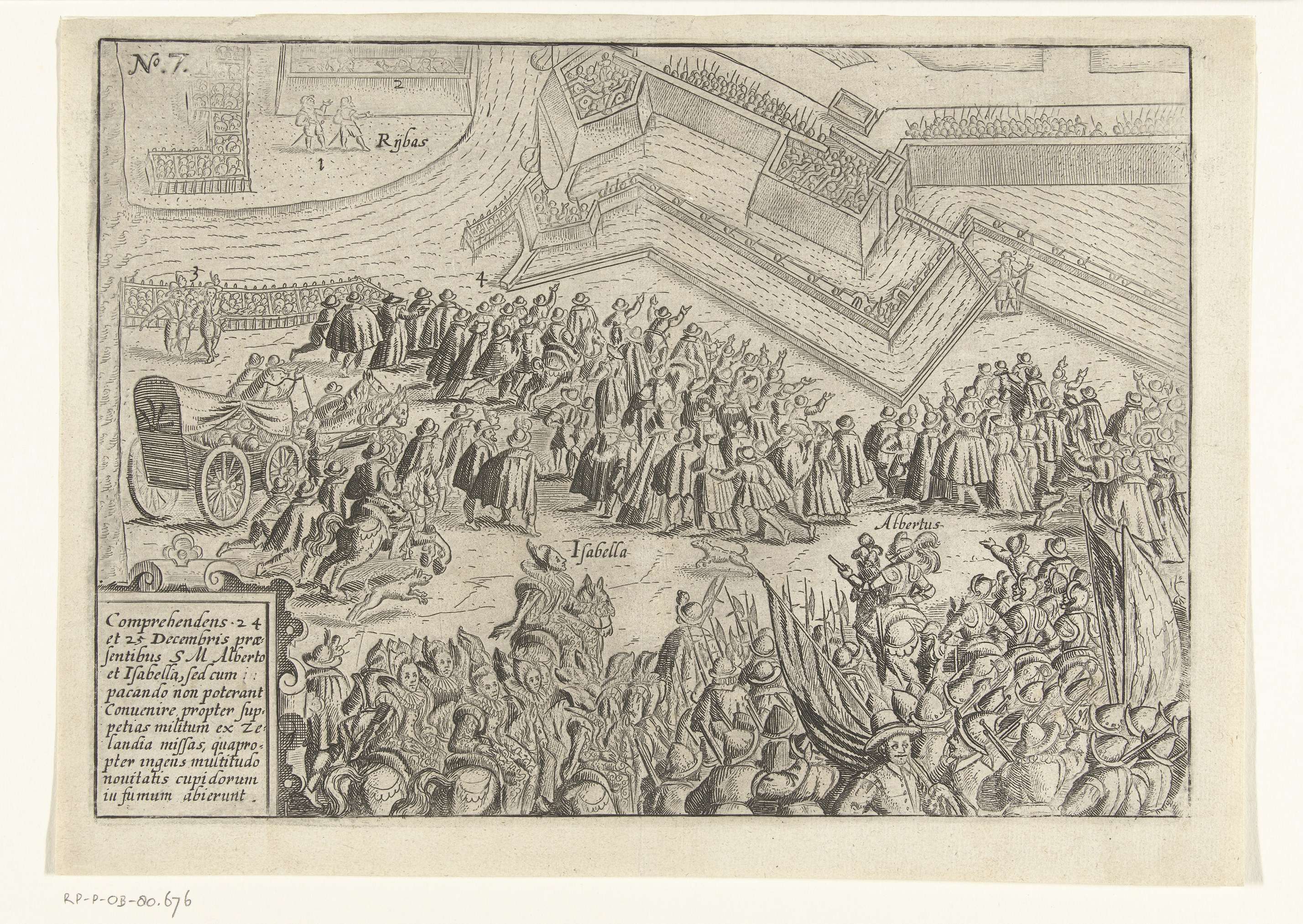 De wapenstilstand op 24-25 december 1601. Isabella en Albrecht vertonen zich tussen een grote menigte voor de belegerde stad. Linksonder een cartouche met een opschrift in het Latijn. Rechtsonder een cartouche met opschrift in het Latijn. Linksboven genummerd: 7.