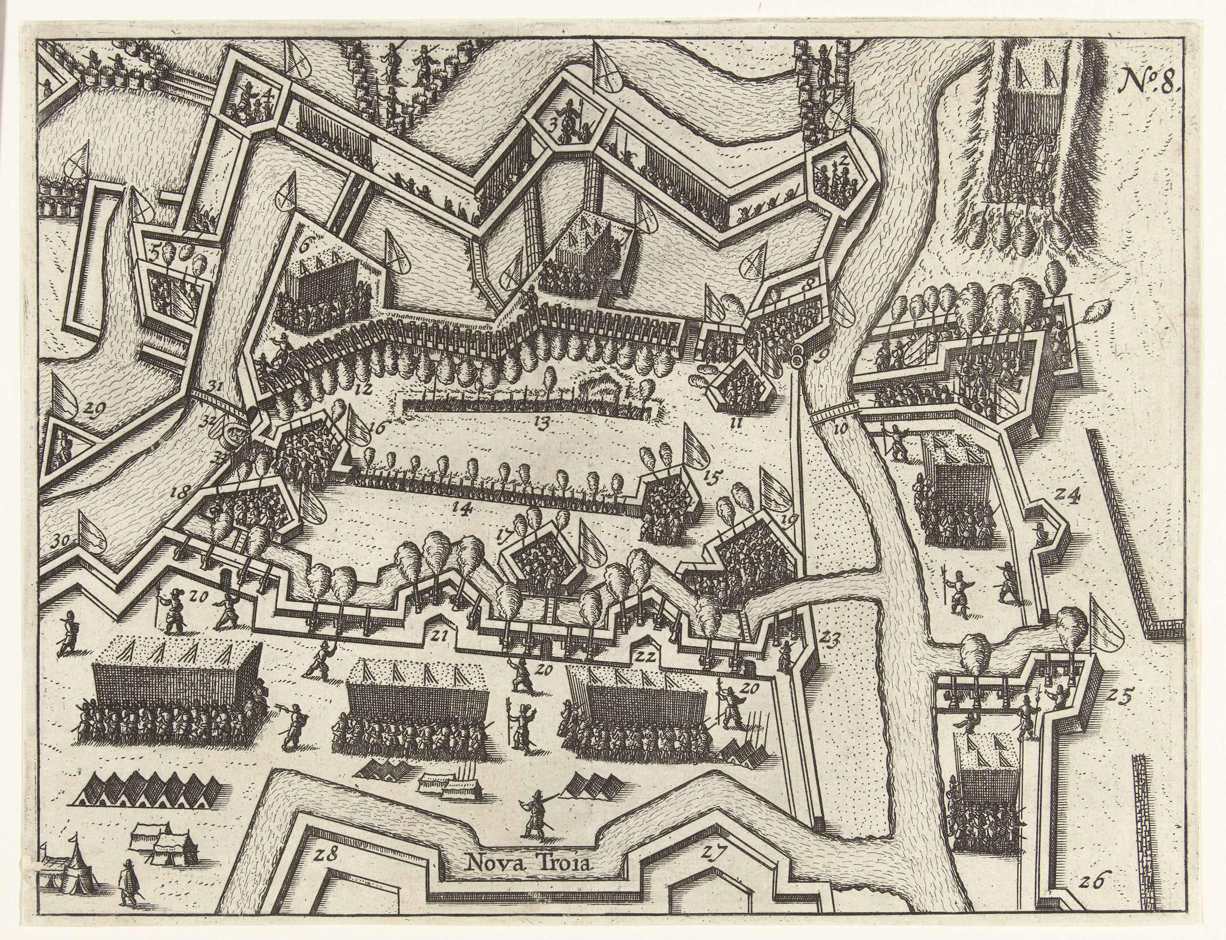 Beleg van Oostende: de drie afsnijdingen en het Nieuwe Troje, 1604. Rechtsboven genummerd: 8.