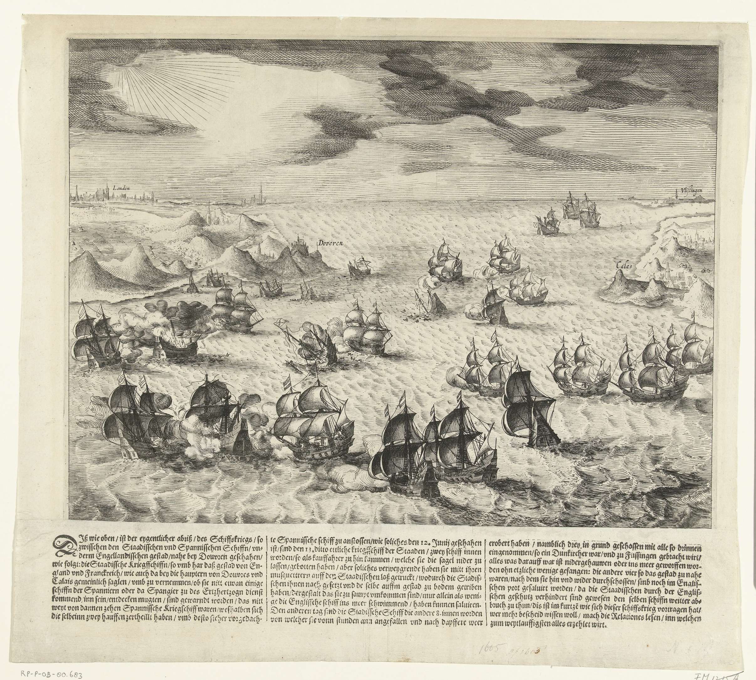 Zeeslag tussen Staatse en Spaanse schepen in het Kanaal voor de Engelse kust bij Dover, 12-13 juni 1605. Links de Engelse kust met Dover en in de verte Londen, rechts de Franse kust met Calais en in de verte Vlissingen. De Staatse vloot onder luitenant-admiraal Willem de Zoete, heer van Haultain, onderschept een Spaanse troepentransport ...