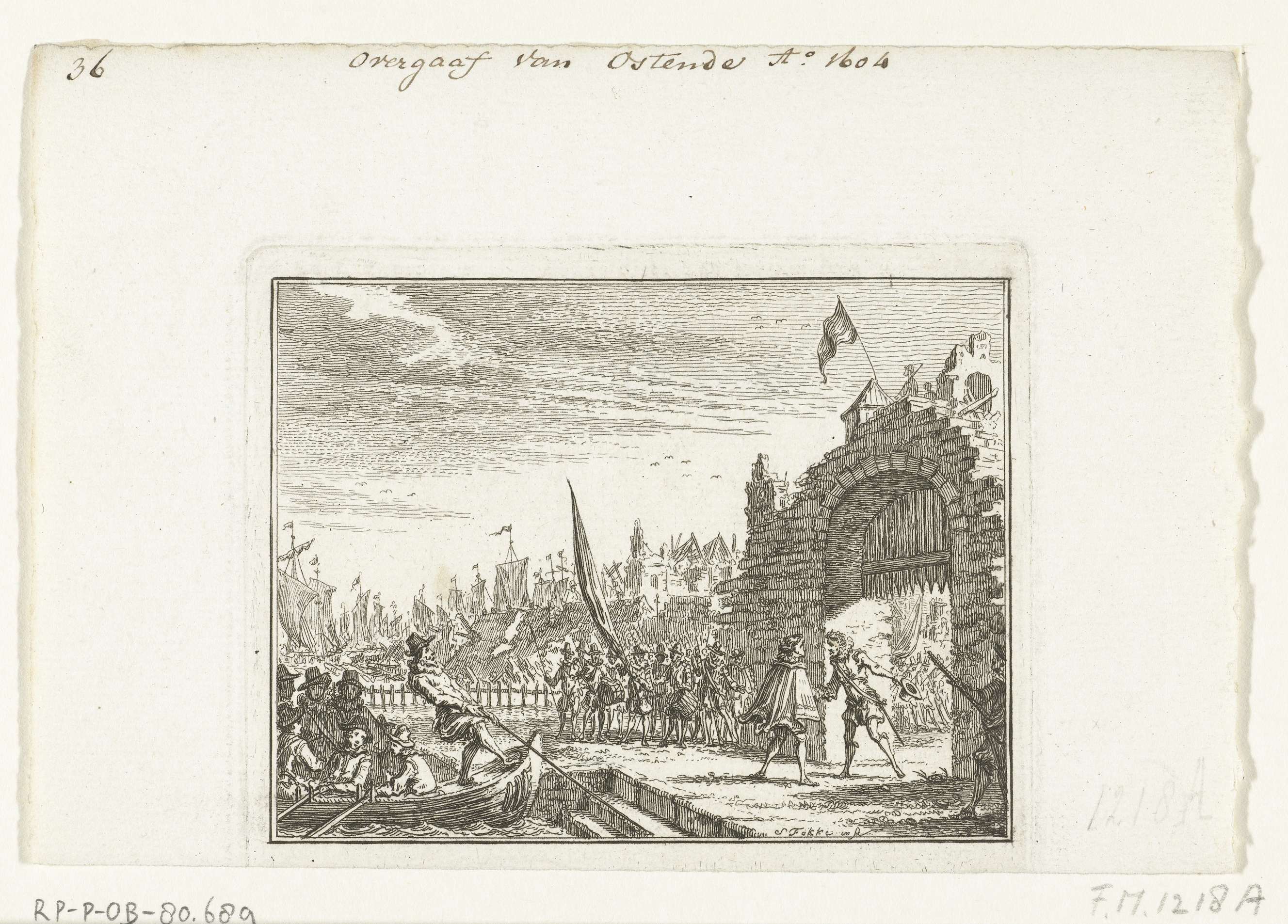 De overgave van de stad Oostende aan het belegerende Spaanse leger, 20 september 1604. Op de voorgrond een roeibootje met personen aan de waterkant, twee afgevaardigden schudden elkaar de hand bij een verwoeste stadpoort.