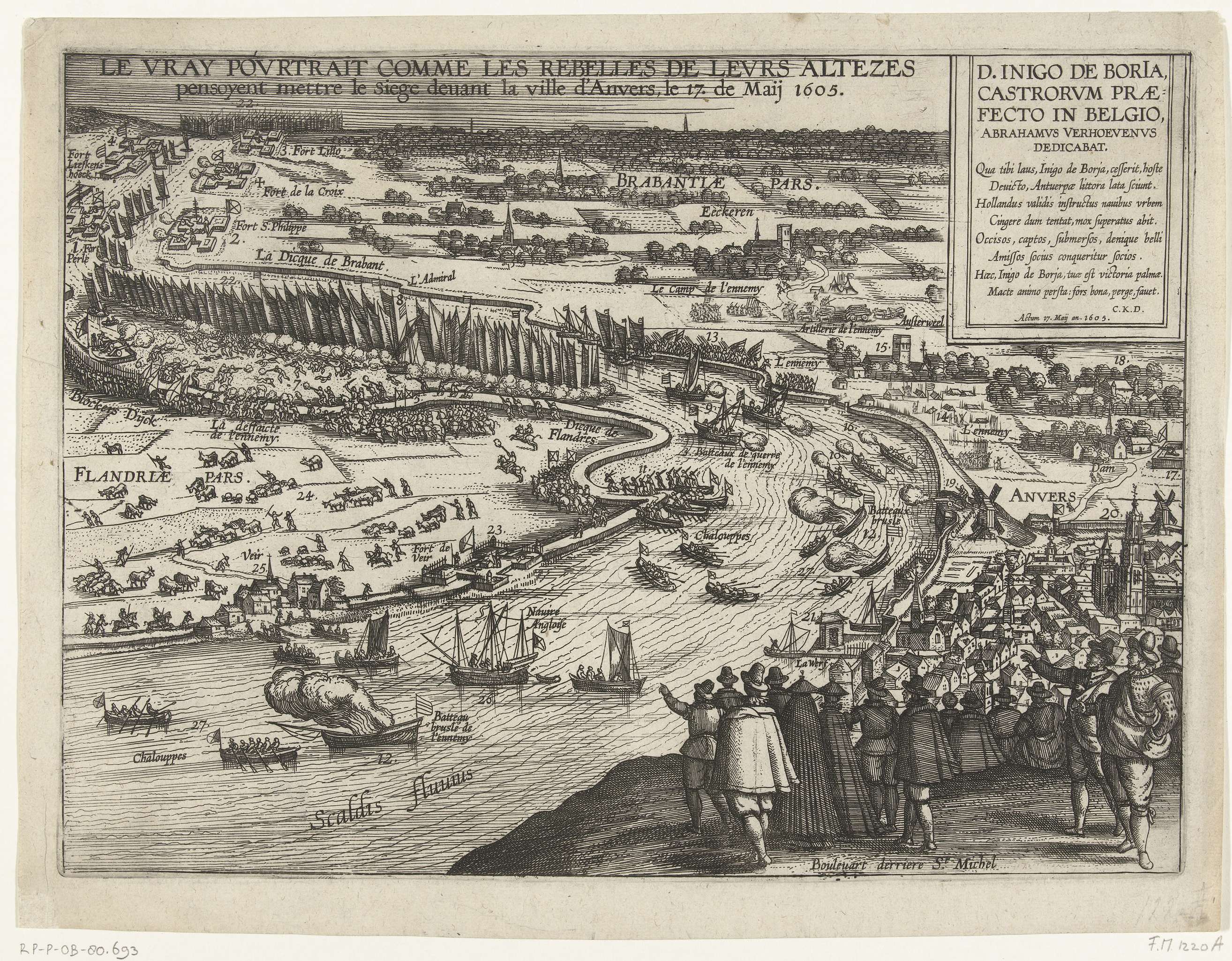 De mislukte aanslag op Antwerpen uitgevoerd door een Staatse vloot onder bevel van graaf Ernst Casimir van Nassau, 17 mei 1605. De Staatse vloot op de Schelde wordt beschoten vanuit de forten en stellingen langs de oevers. Linksboven zware gevechten bij de Blokkersdijk. Op de voorgrond kijken Antwerpenaren naar de gevechten. Rechtsboven een cartouche met ...