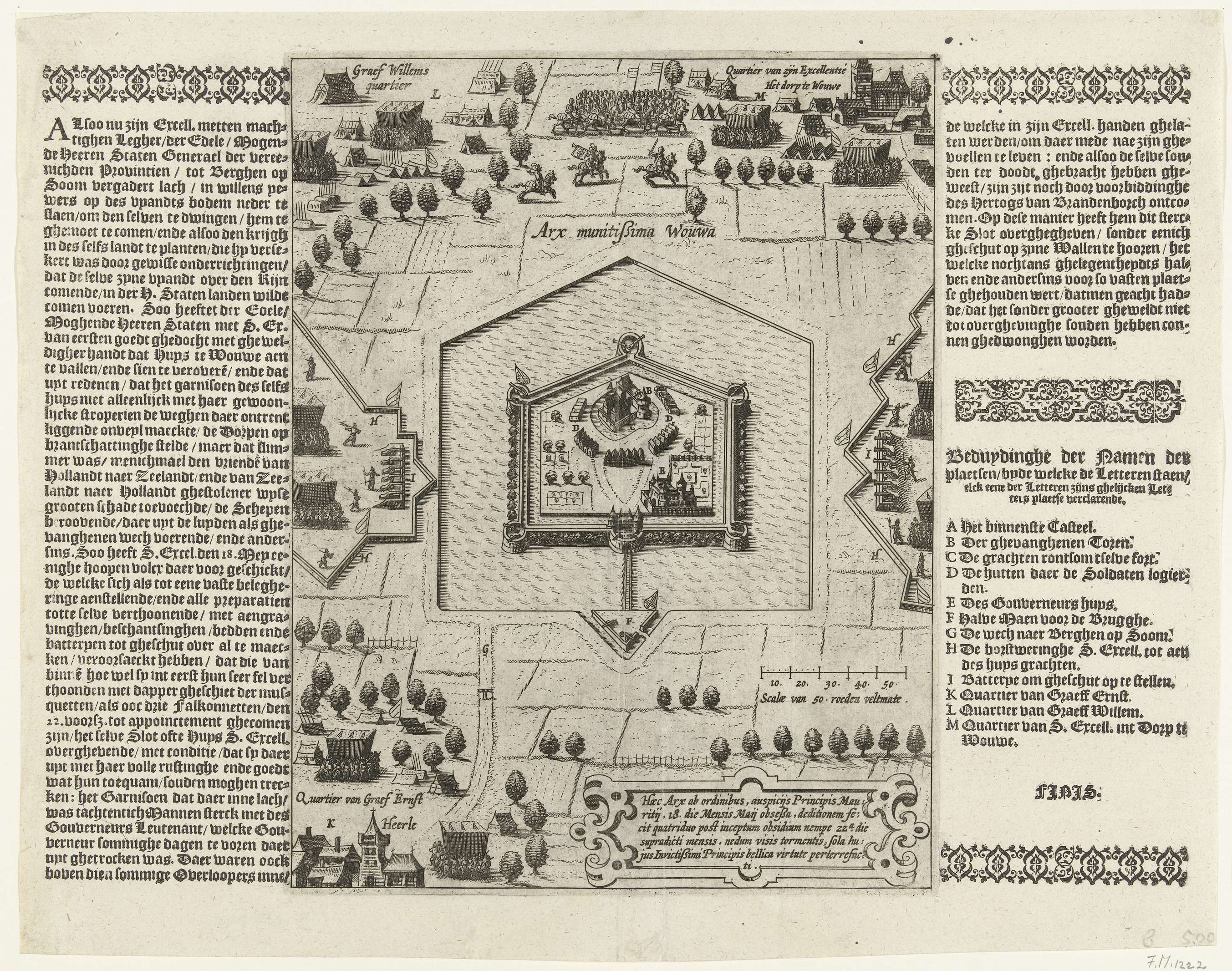 Verovering van het kasteel van Wouw bij Bergen op Zoom door het Staatse leger onder prins Maurits, 22 mei 1605. In het midden het door water omringde kasteel. Bovenaan het kwartier van de prins in het dorp Wouw, onderaan het kwartier van graaf Ernst Casimir in dorp Heerle. Rechtsonder een cartouche met opschrift in het ...