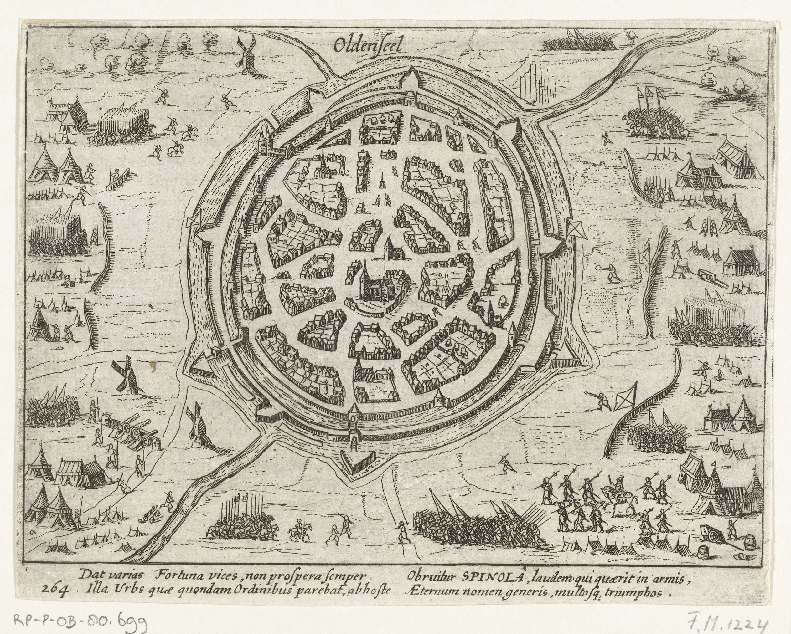 Verovering van Oldenzaal door Spinola, 10 augustus 1605. Plan van de stad met de belegeraars in het omliggende land. Met onderschrift van 4 regels in het Latijn. Genummerd 264. Bedrukt op achterzijde met tekst in het Latijn.