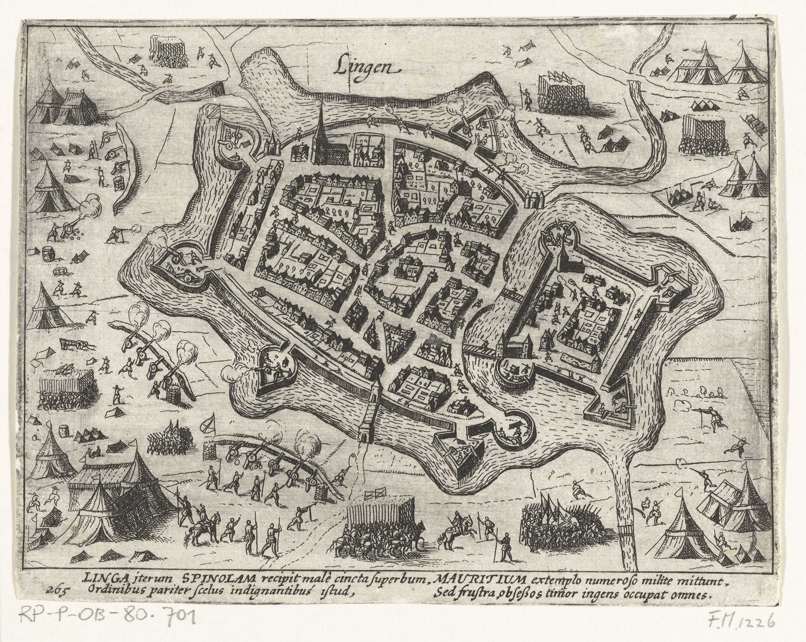 Verovering van Lingen door Spinola, 21 augustus, 1605. Plan van de stad met de belegeraars in het omliggende land. Met onderschrift van 4 regels in het Latijn. Genummerd 265. Bedrukt op achterzijde met tekst in het Latijn.