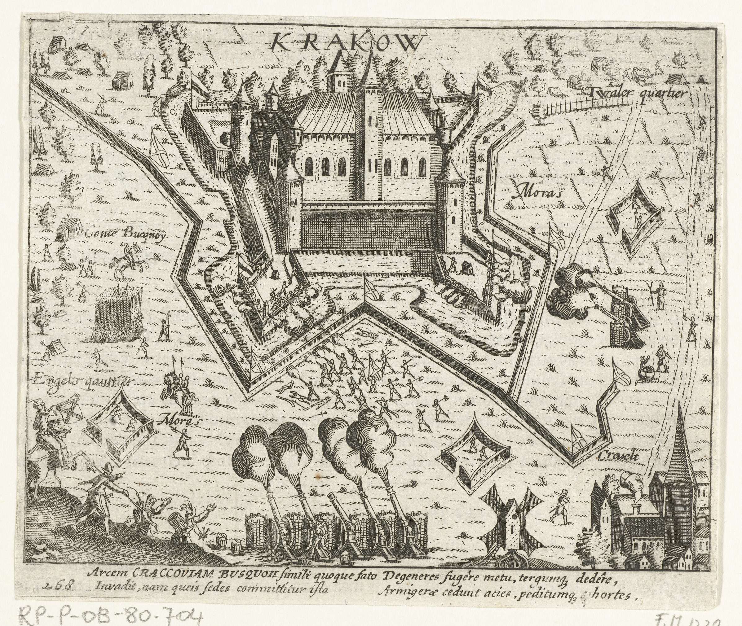 Kasteel Krakow (Burcht Krakau) bij Krefeld belegerd (vanaf 4 november) en ingenomen voor Spinola door de troepen onder de graaf van Bucquoy, 7 november 1605. Het kasteel wordt beschoten door het Spaanse leger. Met onderschrift van 4 regels in het Latijn. Genummerd 268. Bedrukt op achterzijde met tekst in het Latijn.