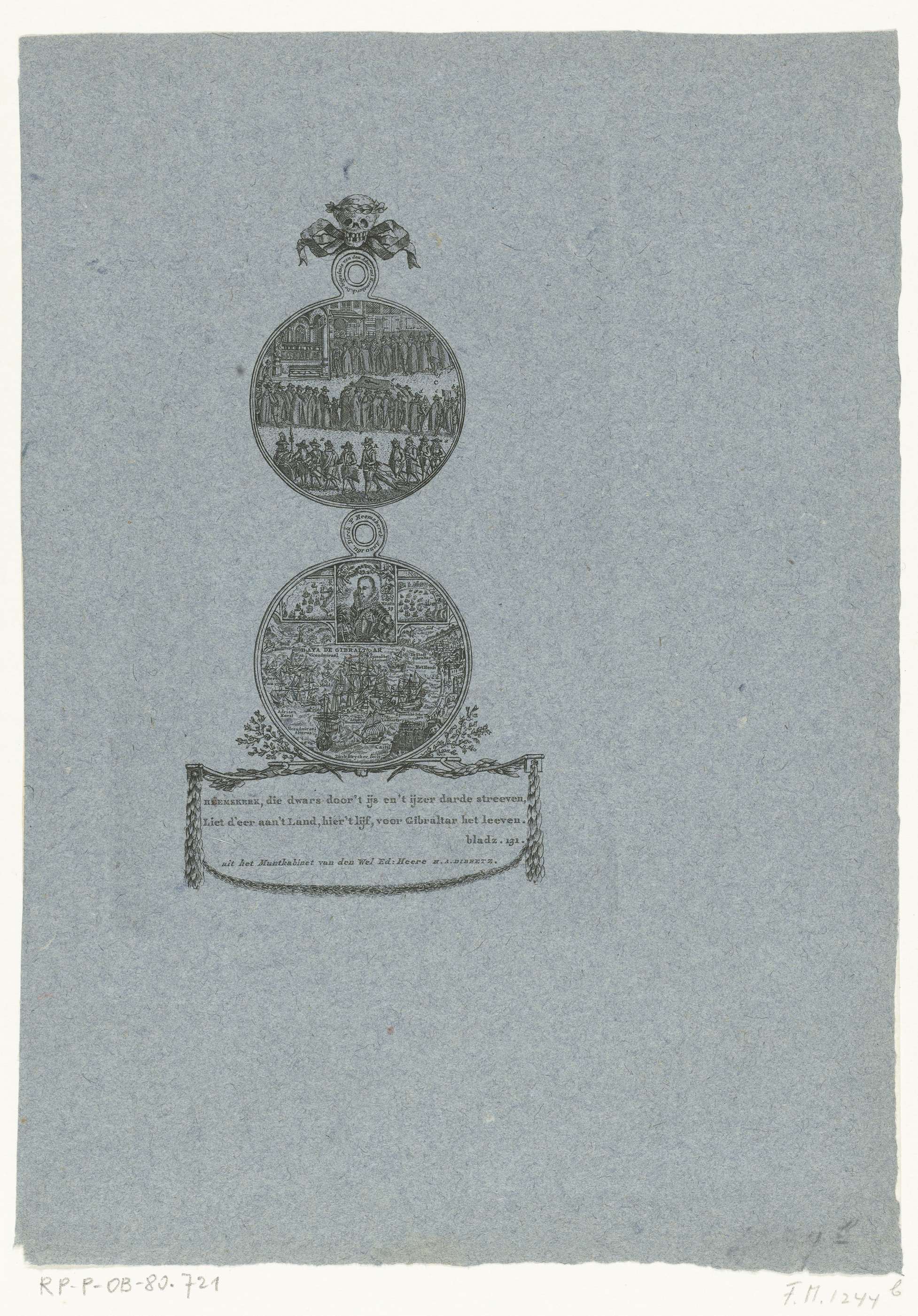 Medaille op het overlijden van Jacob van Heemskerck tijdens de zeeslag in de baai van Gibraltar op 25 april 1607. Voorstelling van de zeeslag, portret en enkele details, op de keerzijde de begrafenis van de admiraal in de Oude Kerk te Amsterdam op 8 juni 1607. Bovenaan een doodshoofd met krans en strik. Onderaan twee ...