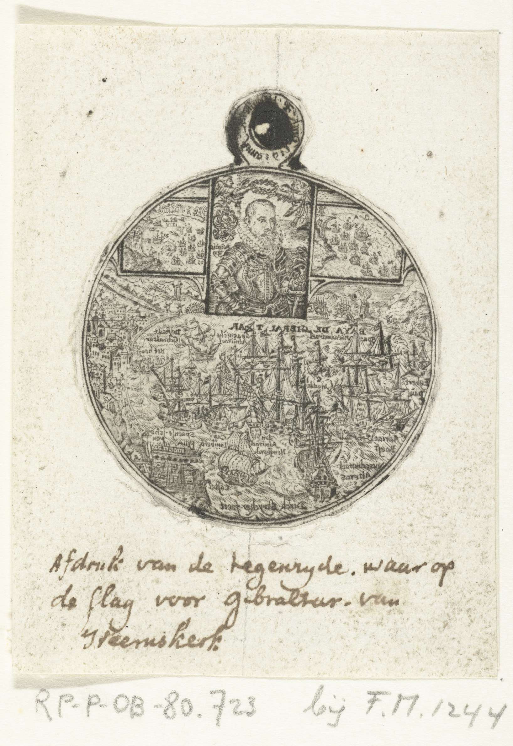 Afdruk van de penning op het overlijden van Jacob van Heemskerck tijdens de zeeslag in de baai van Gibraltar op 25 april 1607. Afdruk van de zijde met de zeeslag en het portret. Vervaardigd van de draagpenning in het muntkabinet van de heer H.A. Dibbetz.